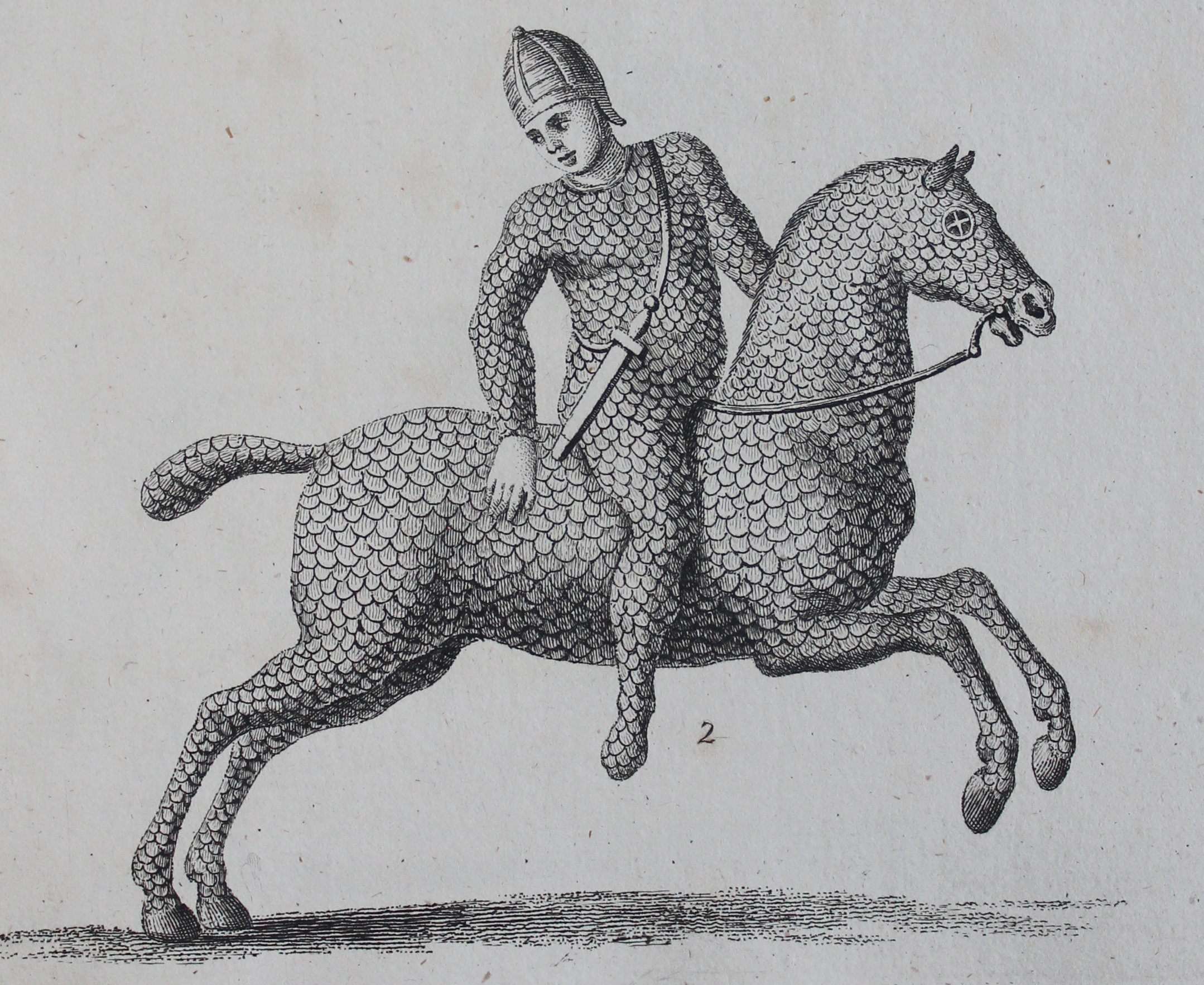The library holds a copy of The History and Art of Horsemanship by Richard Berenger (1719 or 20-1782), who was Gentleman of the Horse to King George III. It contains this amusing illustration of a Sarmatian rider and his horse, both completely covered in scale armour. The Sarmatian people were skilled equestrians who roamed the steppes of central Asia from the 5th century BCE to the 4th century CE. Whilst they did indeed use scale armour, it is hard to imagine that it can have been quite as form-fitting as this image suggests!
