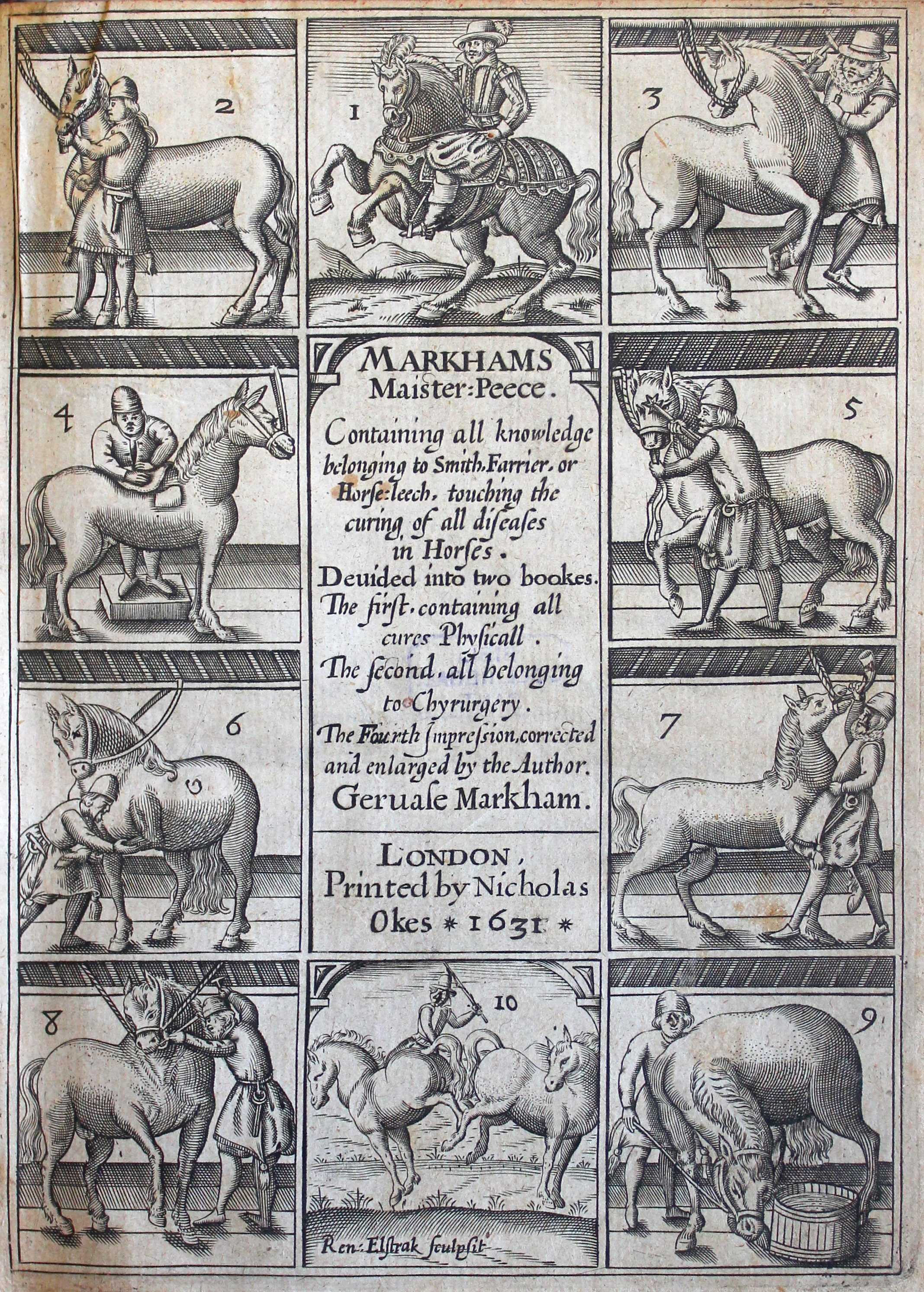 Engraved frontispiece from Markhams Maister-peece: Contayning All Knowledge Belonging to the Smith, Farrier, or Horse Leech, Touching the Curing of All Diseases in Horses by Gervase Markham, London, 1631. Classmark: Chawner.A.6.29