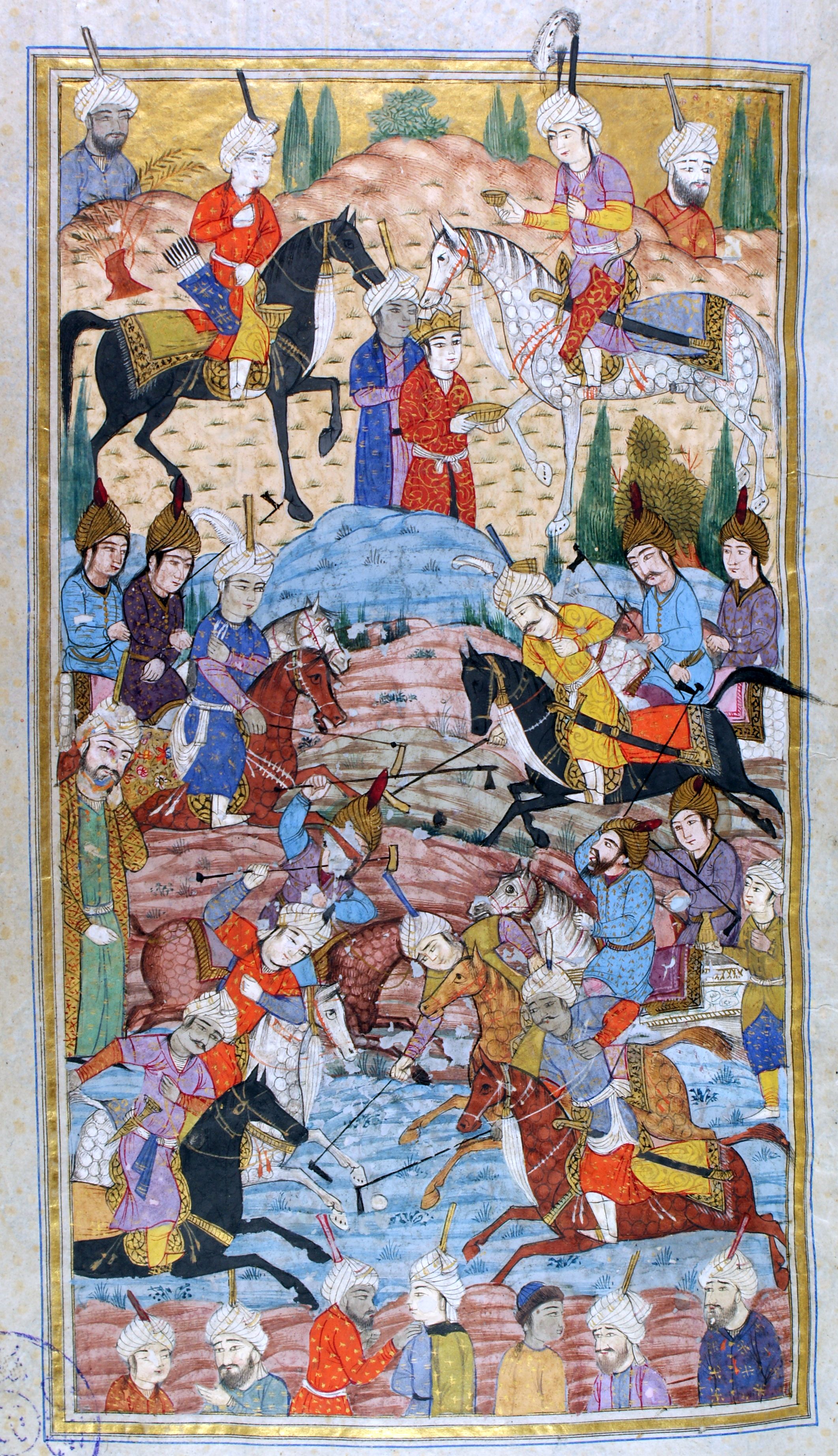 The manuscript also contains a lively illustration of a polo match, featuring more elegant and diversely coloured horses. The sport has Persian origins dating back to around the 6th century BCE.