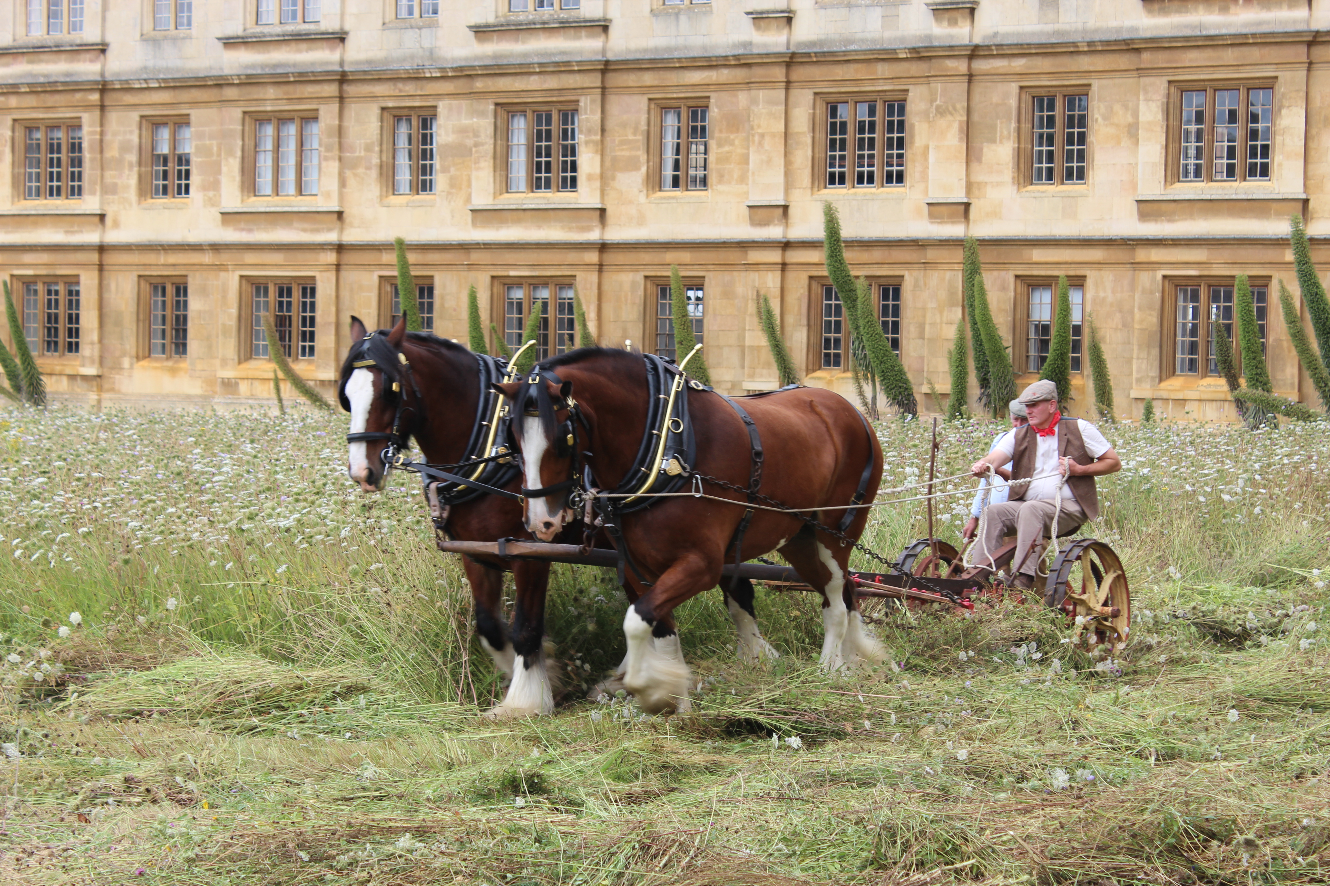 The use of horses for agricultural tasks is not entirely a thing of the past, and indeed, the glorious wildflower meadow on our College back lawn is harvested each August by a team of shire horses from the Waldburg Shires Stables in Huntingdon. The horses are later attached to a hay wain to remove the baled-up hay. This use of traditional methods helps to minimise the carbon footprint of the whole process. The photos below were taken during the very first harvest in the summer of 2021.