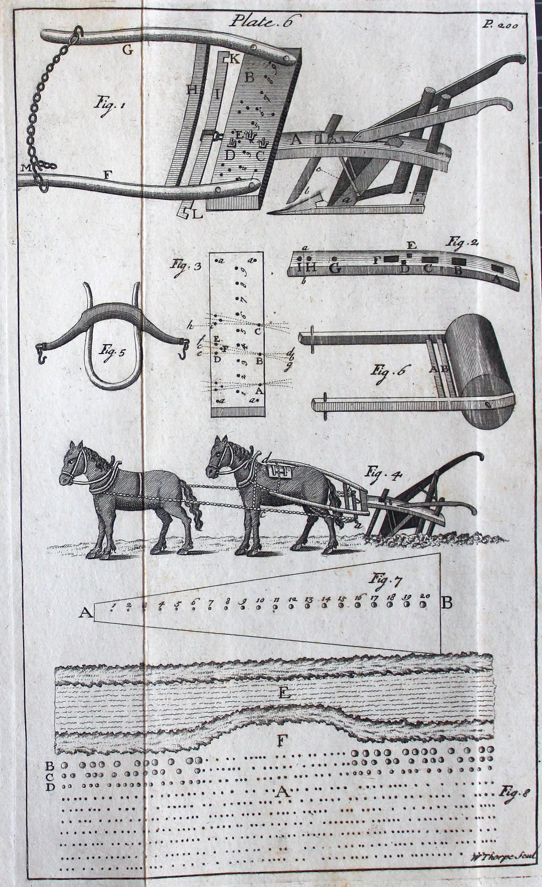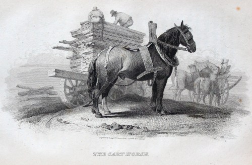 By the time Tull was writing it was common practice to use large, muscular draught or cart horses to pull farm machinery and other heavy loads. Prior to this period, agricultural yields of winter crops had not been high enough to provide the large amount of food such horses required to function. The poor horse pictured below is awaiting the task of pulling a wagon piled precariously high with wooden planks!