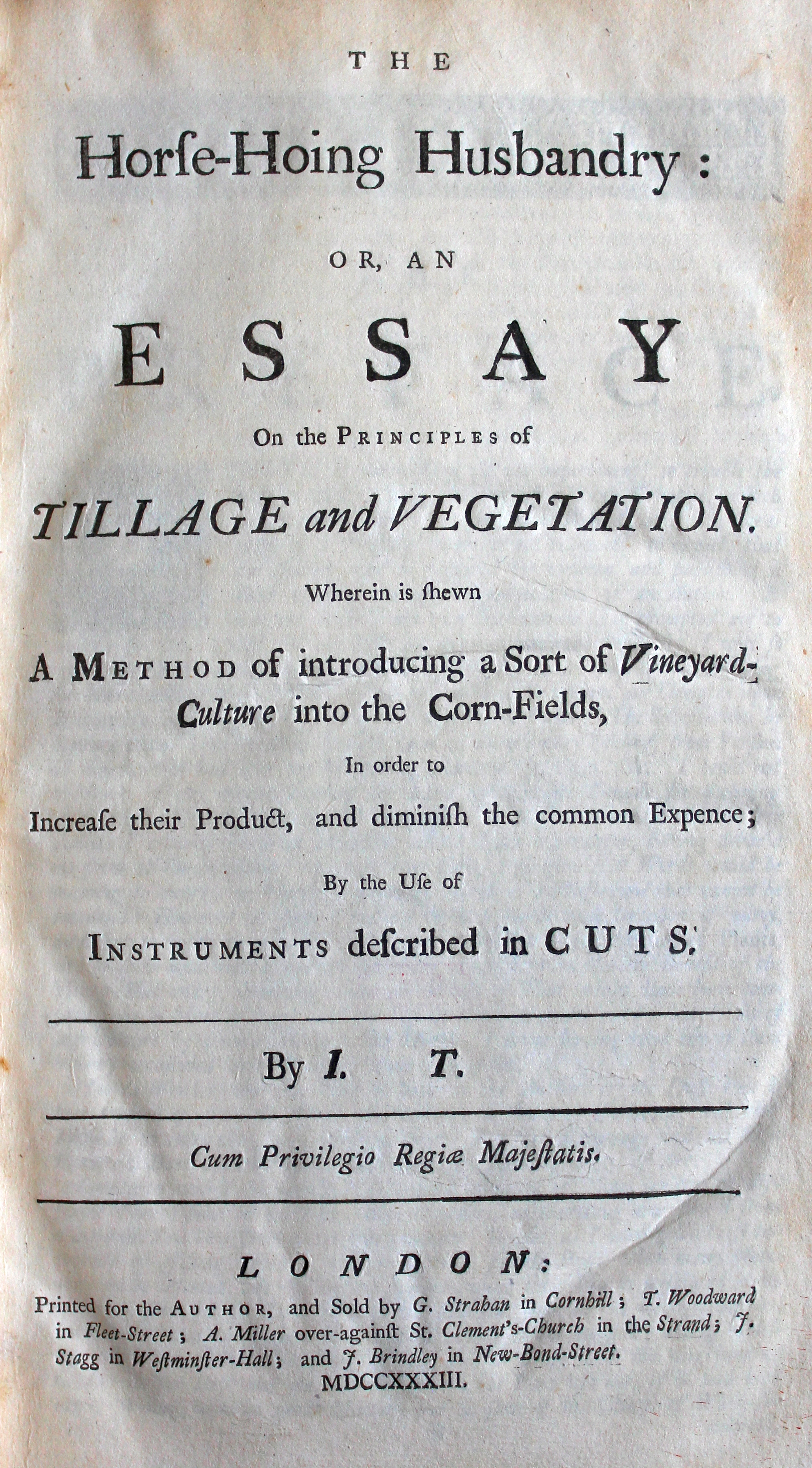 Title page of The Horse-Hoing Husbandry: or, An Essay on the Principles of Tillage and Vegetation, by Jethro Tull, London, 1733. Classmark: Keynes.F.23.4