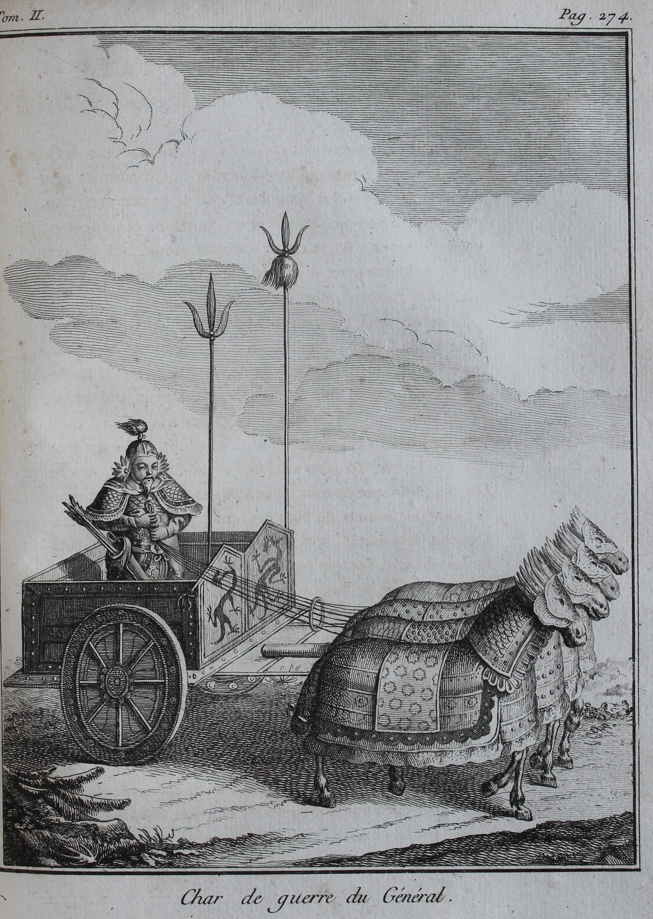 Heavily armoured horses pulling war chariots feature in an early eighteenth-century French translation of a twelfth-century work of Chinese history, the Zizhi Tongjian Gangmu. The translator was Joseph-Anne-Marie de Moyriac de Mailla (1669-1748), a Jesuit missionary to China who developed a great interest in Chinese history and learnt the Manchu language in later life. Accompanying illustrations in his text show both a large horse-drawn chariot carrying three soldiers and the slightly smaller but more embellished chariot of a General. The horses, resplendent in their elaborate head-pieces, look alert and well disciplined.