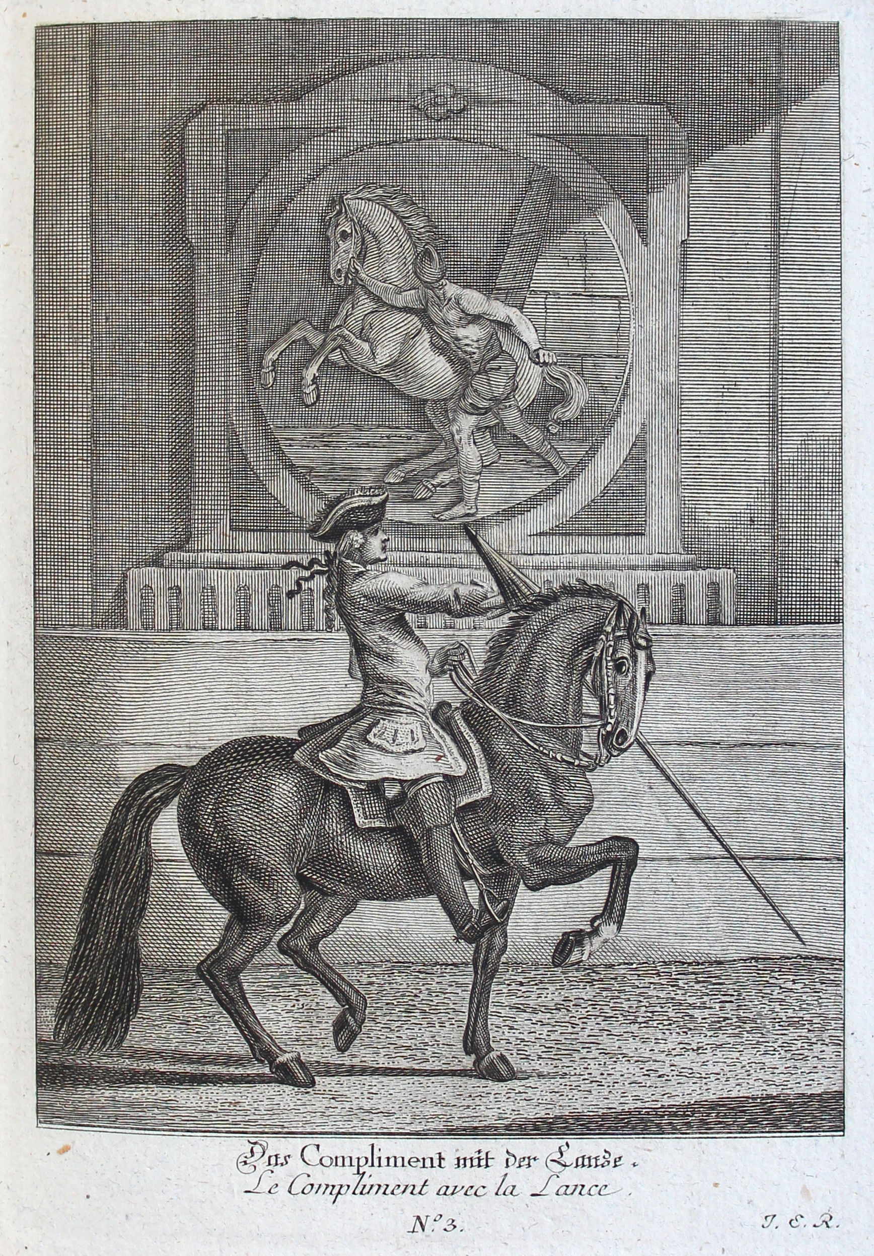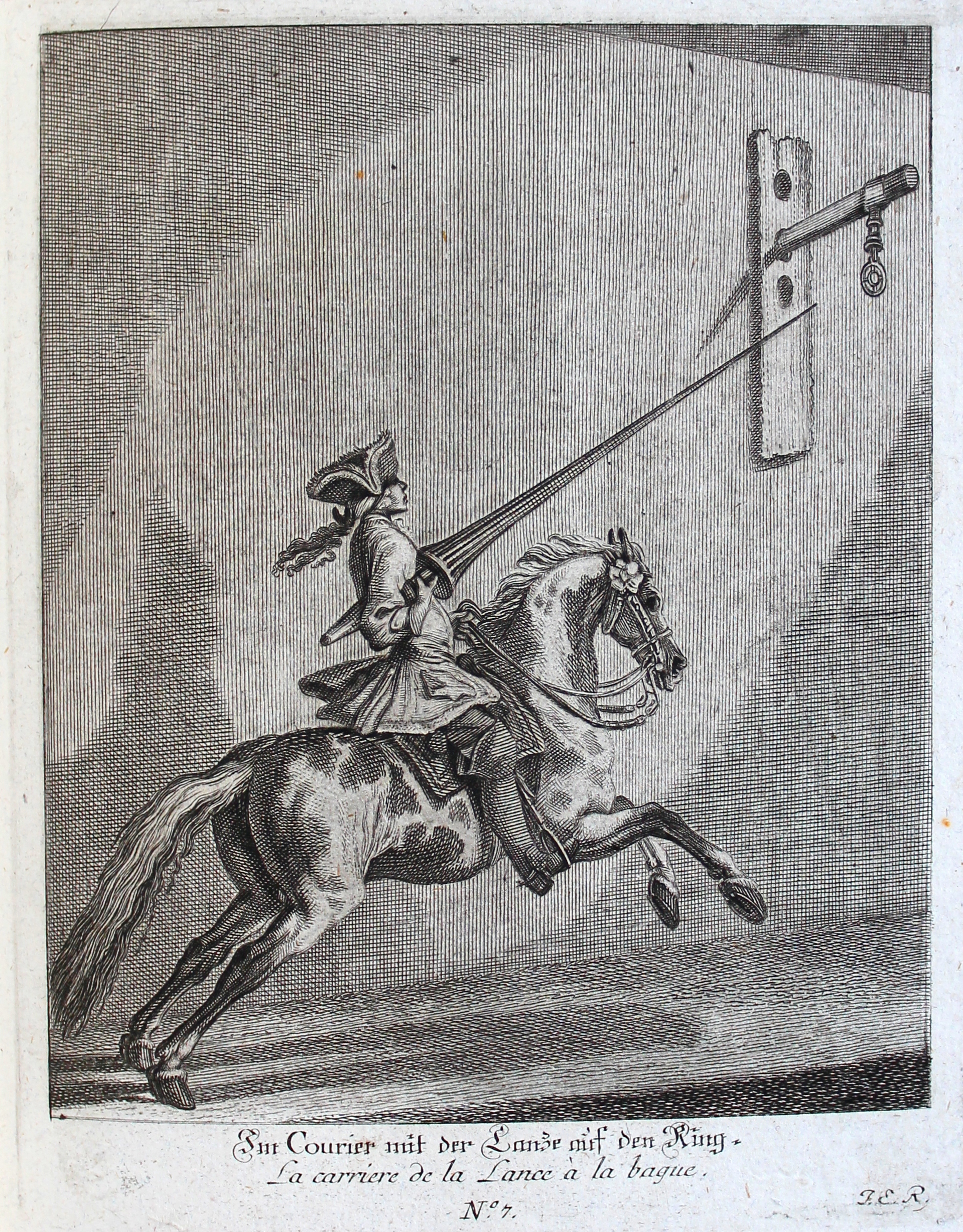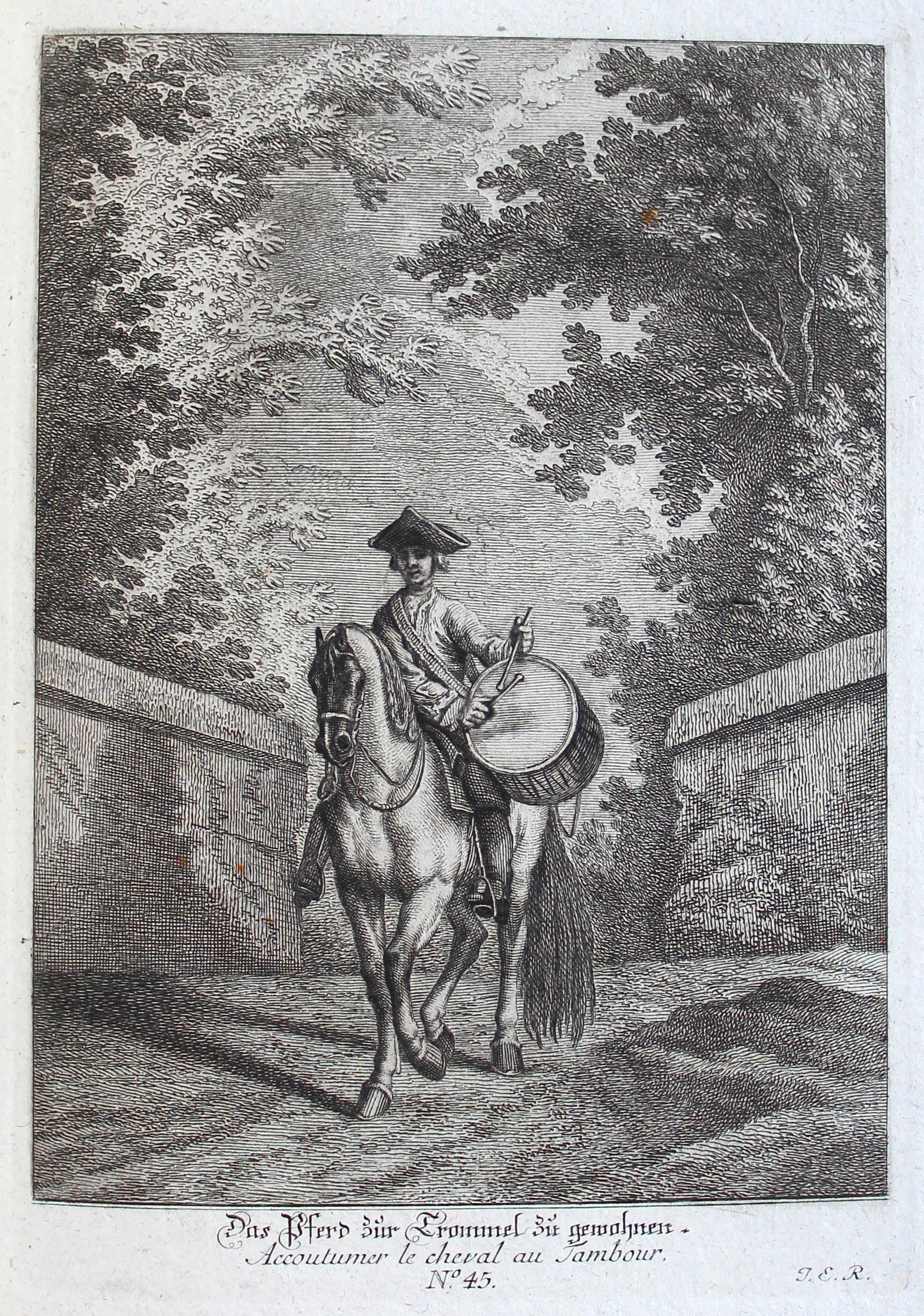It would be remiss of us not to include a substantial helping of engravings from a wonderful volume by Johann Elias Ridinger (1698-1767), a noted German artist, who specialised in painting and sketching animals, especially horses. Ridinger spent three years observing and sketching at a riding school and this experience shines through in the quality and realism of his work. The engravings below illustrate many aspects of equestrian training, including learning the use of weapons and military drums on horseback.