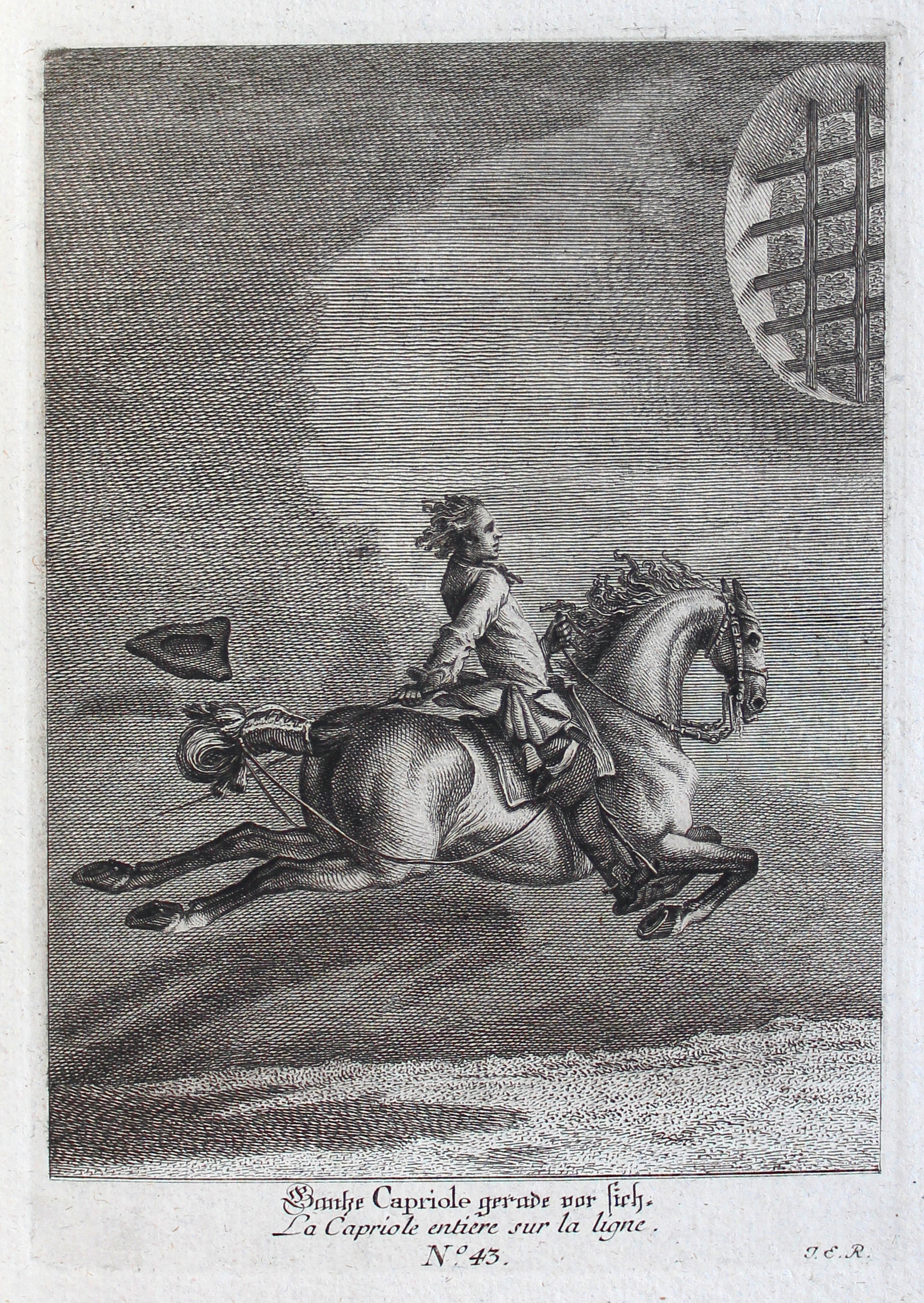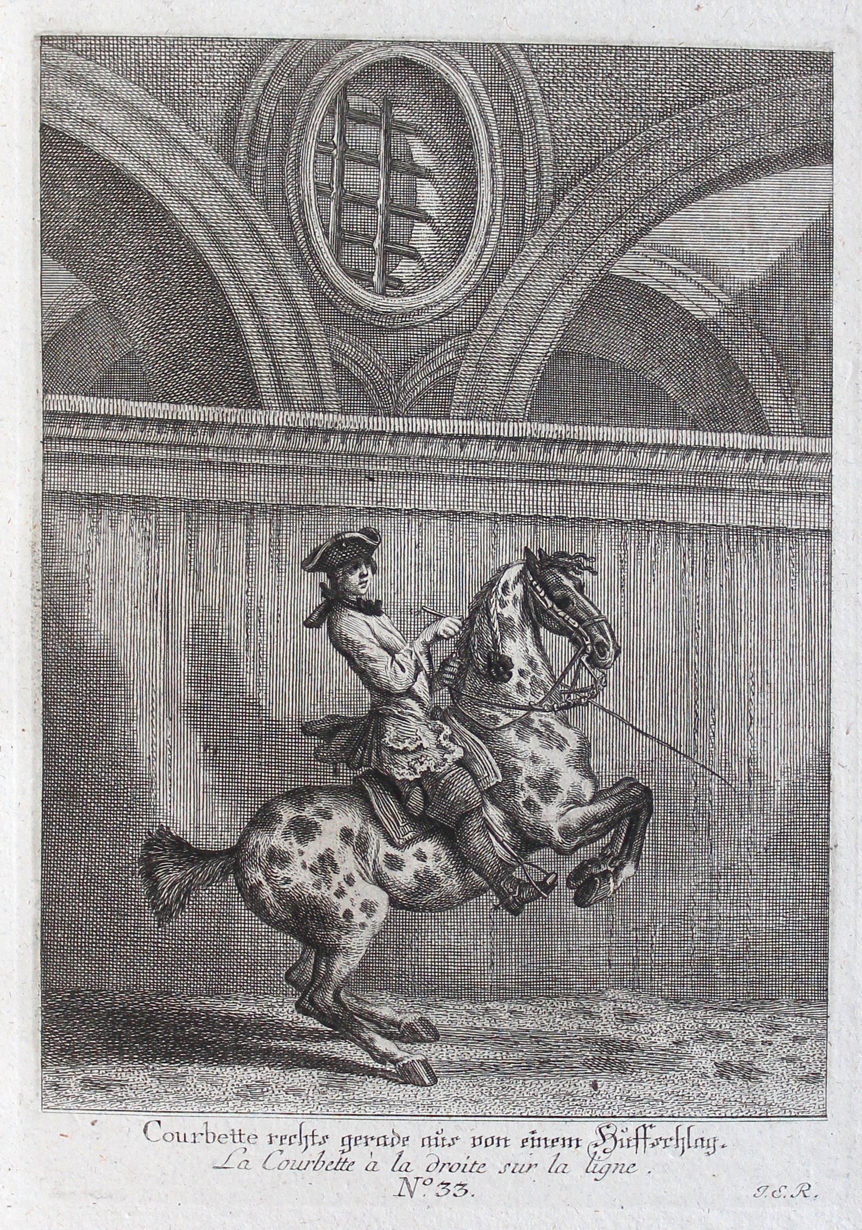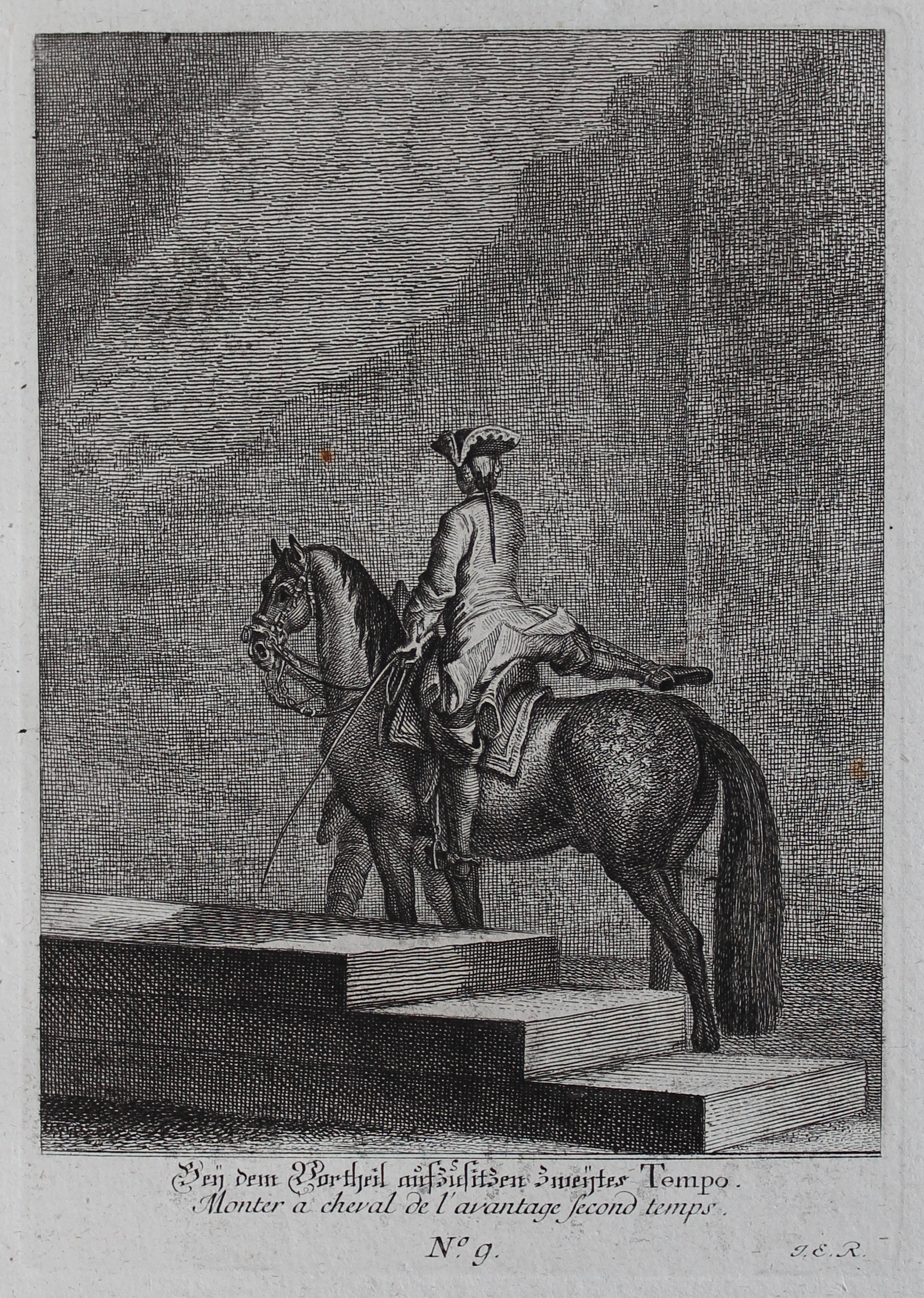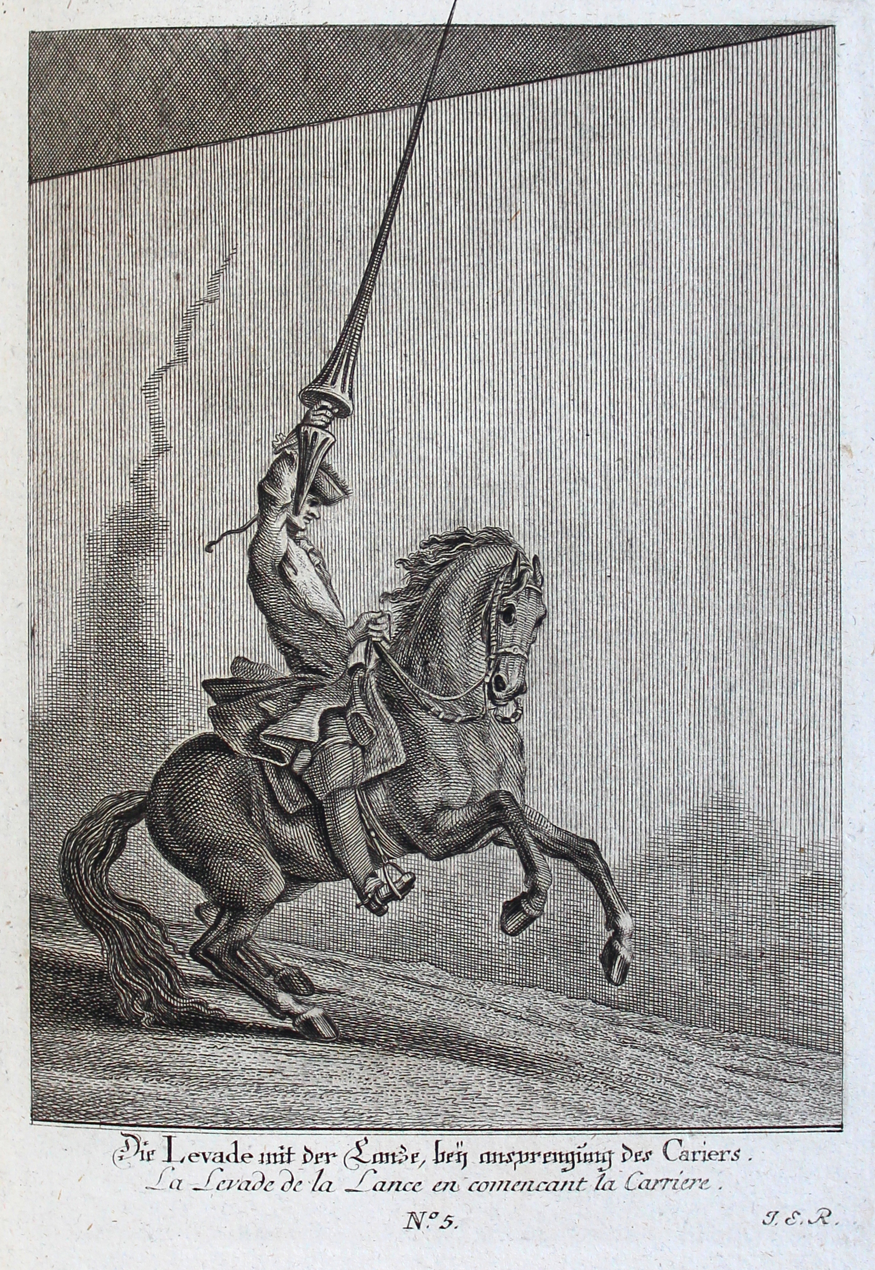 It would be remiss of us not to include a substantial helping of engravings from a wonderful volume by Johann Elias Ridinger (1698-1767), a noted German artist, who specialised in painting and sketching animals, especially horses. Ridinger spent three years observing and sketching at a riding school and this experience shines through in the quality and realism of his work. The engravings below illustrate many aspects of equestrian training, including learning the use of weapons and military drums on horseback.