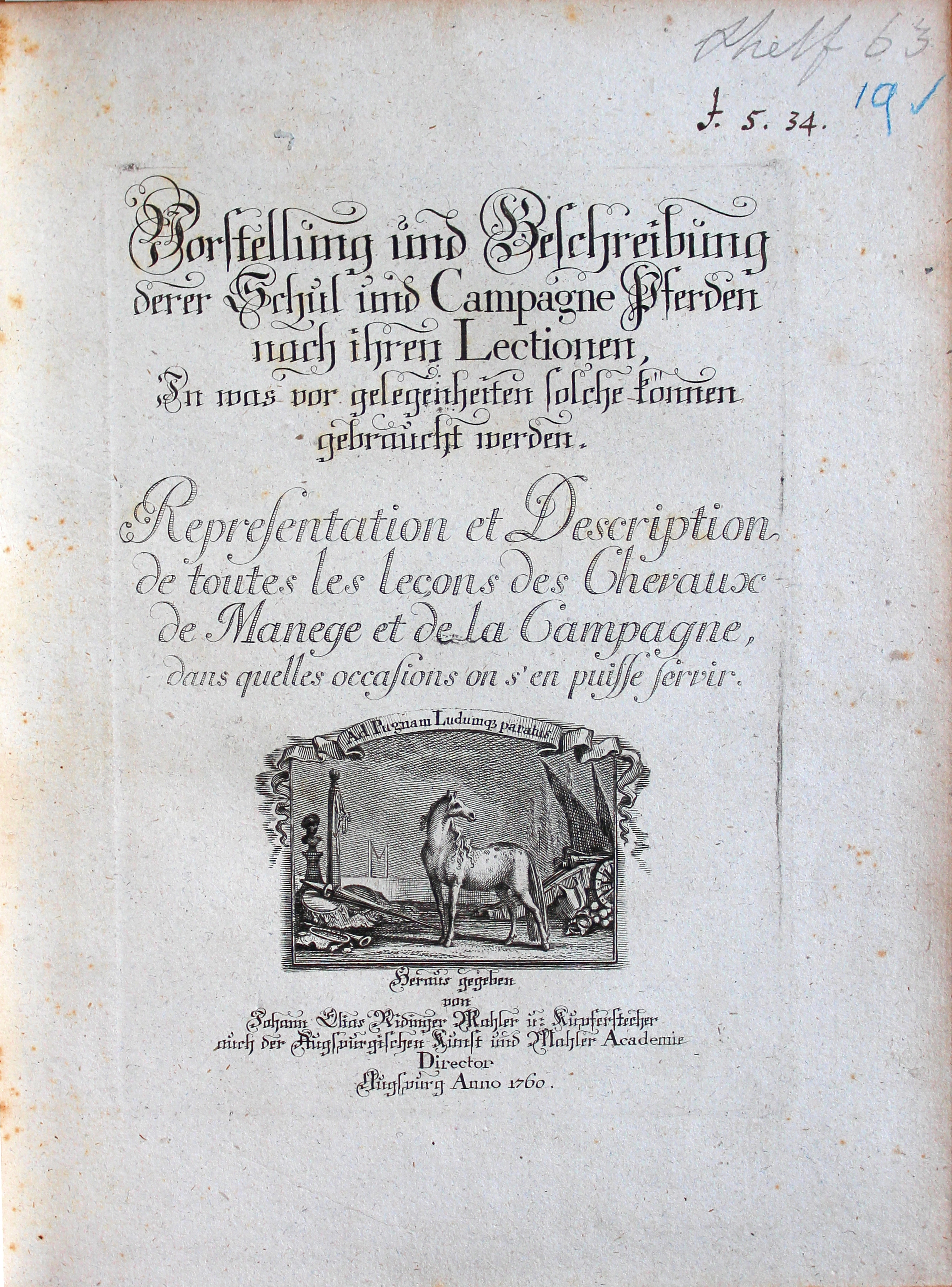 Title page of Vorstellung und Beschreibung derer Schul und Campagne Pferden nach ihren Lectionen, in was vor Gelegenheiten solche können gebraucht werden by Johann Elias Ridinger, Augsburg, 1760. Classmark: Thackeray.F.5.34/1