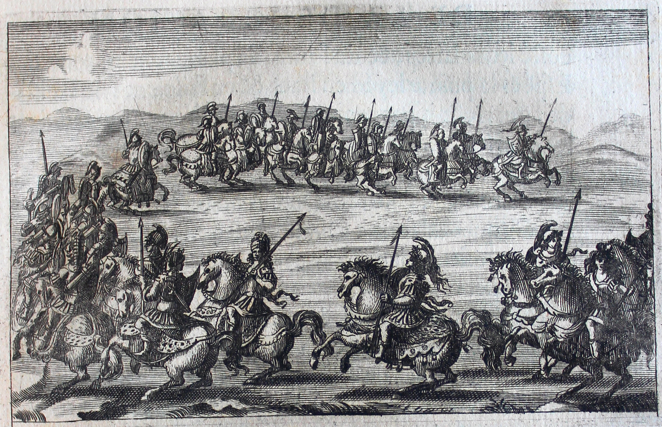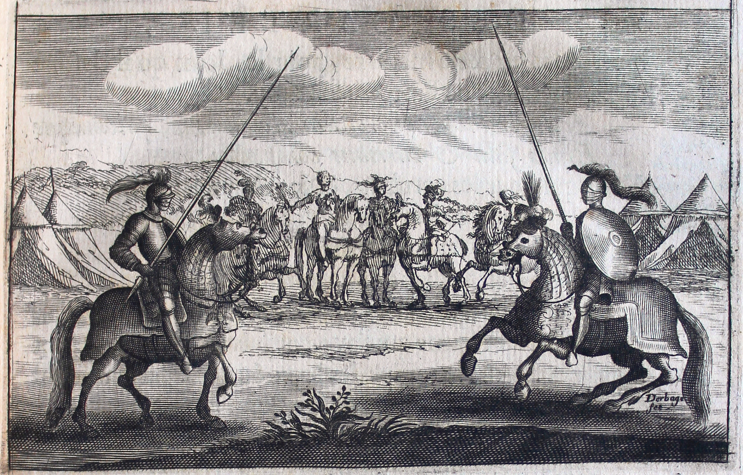 Jousting knights from page 103 of Traité des tournois, ioustes, carrousels, et autres spectacles publics by Claude-François Menestrier, Lyon, 1669. Classmark: Thackeray.H.28.13