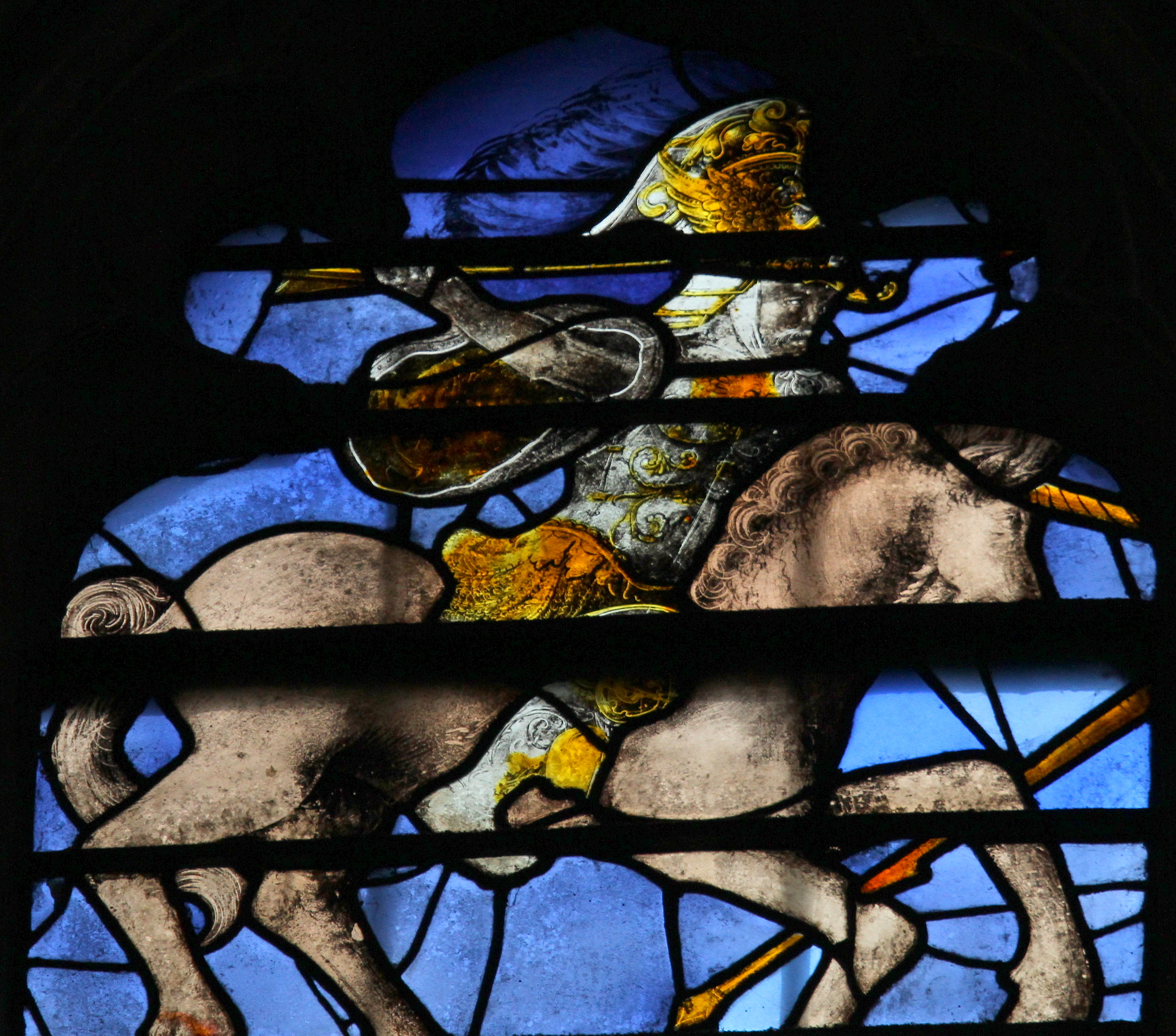 At the very top of window 12.2 in the main part of the Chapel, two mounted warriors face off. The warrior on the left is rendered in the act of throwing his spear, whilst the horse of the one on the right is rearing back with what appears to be a spear or an arrow sticking out of its torso.