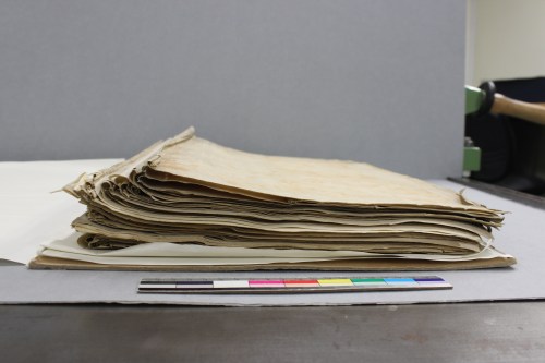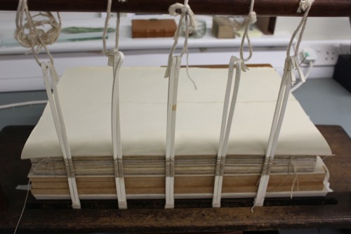 stabilising those that had the worst historic damage using Japanese paper. This is a soft tissue paper, often handmade, of consistent quality and free from impurities such as iron particles which can lead to paper degradation, rust spots, or ‘foxing’. It is transparent so that it can be glued over tears in existing pages while still allowing the text to be read, and allows for easily reversible interventions.