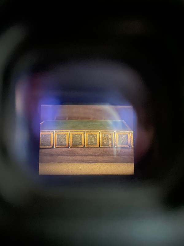 The First Folio book spine as seen through the camera viewfinder. ‘Shakespeare – 1623’ is embossed in gold.