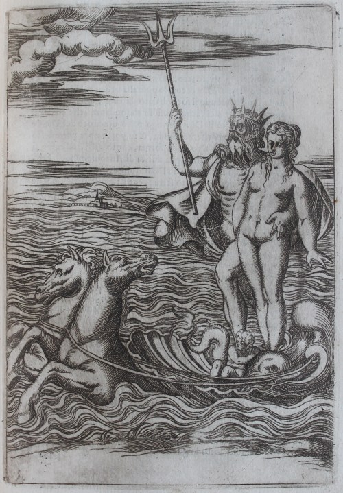 The Greek god of the sea Poseidon and his Roman equivalent Neptune were both said to have travelled in chariots drawn by Hippocampi, creatures which were half horse and half fish or sea monster. The illustration below comes from a work on classical mythology by Italian diplomat and mythographer Vincenzo Cartari (1531?-1590). It depicts Neptune in a sea-chariot with his consort the goddess Amphitrite and the young sea god Palaemon. They are being pulled through the waves by two Hippocampi.