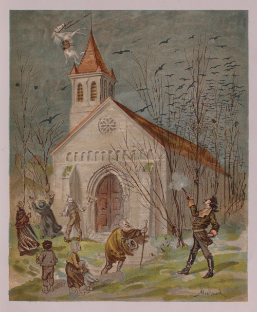 A late nineteenth-century edition of The Adventures of Baron Munchausen from our Rylands Collection of children’s books contains some wonderful colour illustrations by Adolphe-Alphonse Géry-Bichard (1842-1926). Although the Baron does not have a particular named horse accompanying him throughout, horses do feature in many of his tall tales. Included below are illustrations of the Baron shooting through his horse’s bridle to bring him down from where he has become attached to the steeple of a church, and of the Baron extricating himself and his horse from a pond by gripping onto his own hair and pulling!