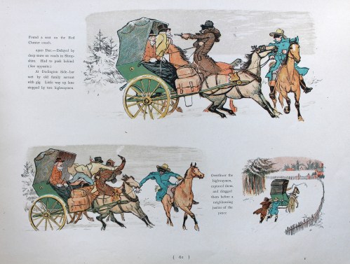 Next, a Christmas excursion is interrupted in even more dramatic circumstances, when the hero’s carriage is attacked by highwaymen! Luckily the miscreants are overpowered when Mr Carlyon (somewhat implausibly) launches himself out of the carriage at one of them and the other is bitten by one of the carriage horses.