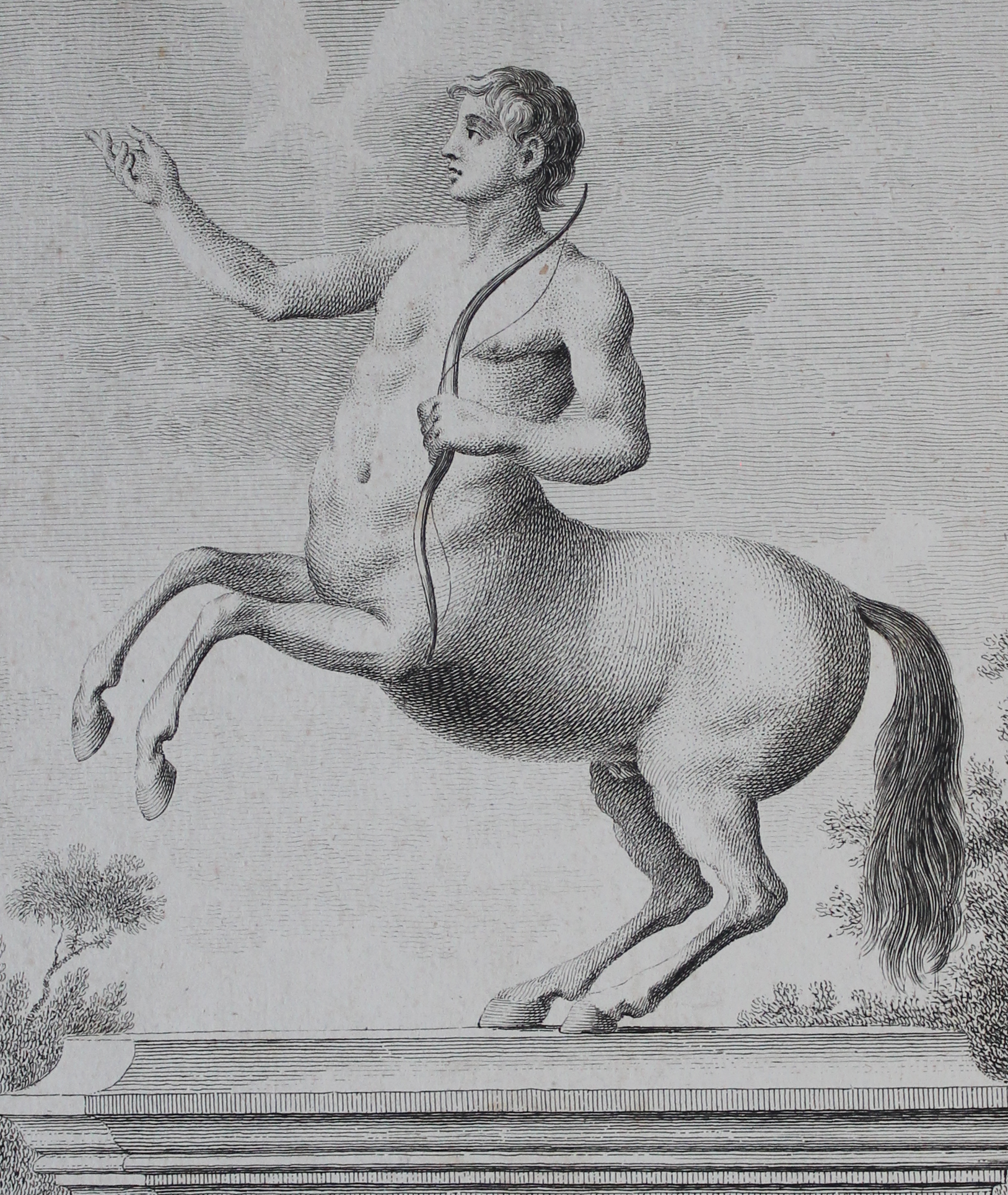 Engraving of a statue of a Centaur holding a bow and rearing back on his hind legs