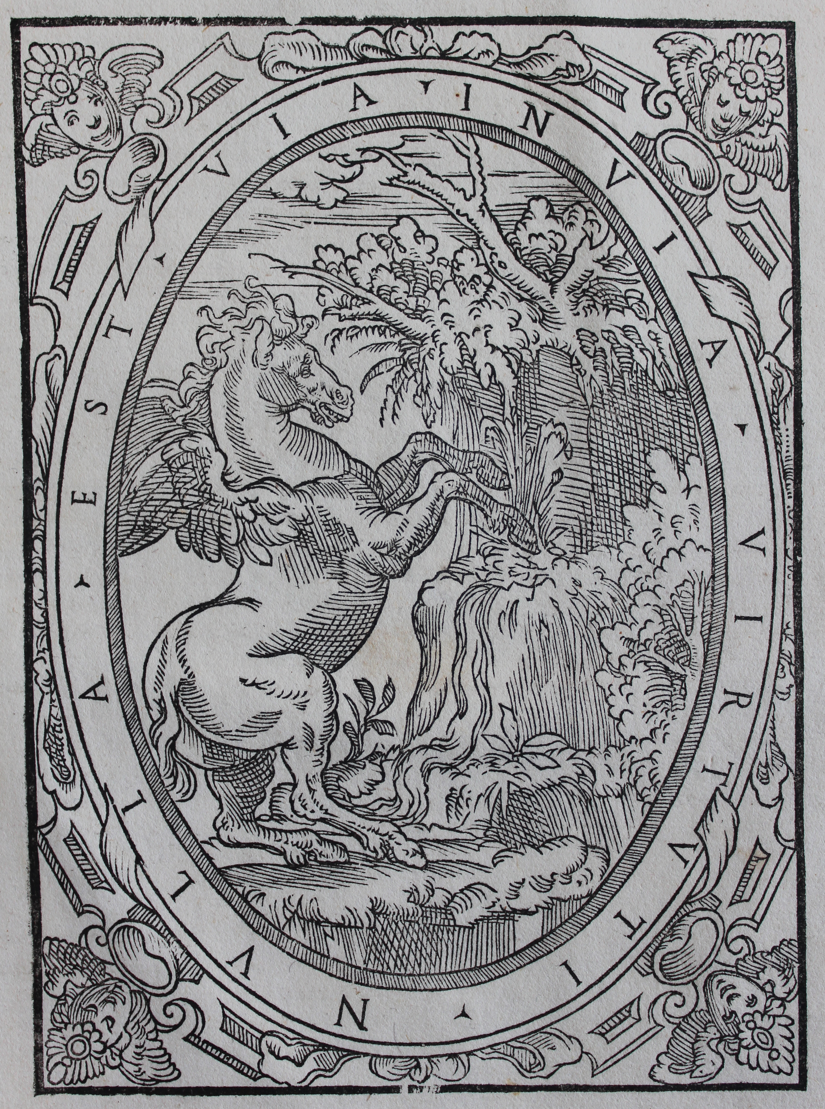 Pegasus printer’s device on fol. L6 of Vrbis Romae topographia by Bartolomeo Marliani, Rome, 1544. Shelfmark: Bury.I.MAR.Urb.1544