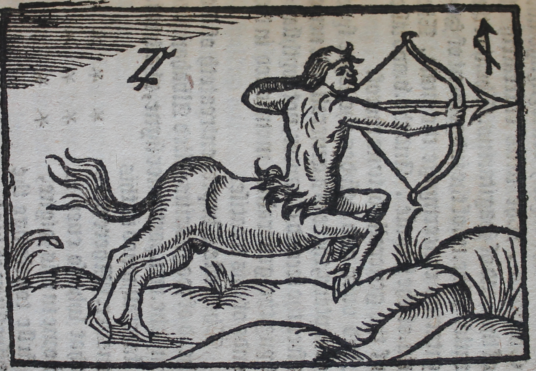 Sagittarius, the constellation and astrological sign, is often depicted as a centaur drawing a bow. One example is this lovely woodcut illustration from an English translation of a sixteenth-century astrological work by Frenchman Richard Roussat, writing under the pseudonym “Arcandam.”