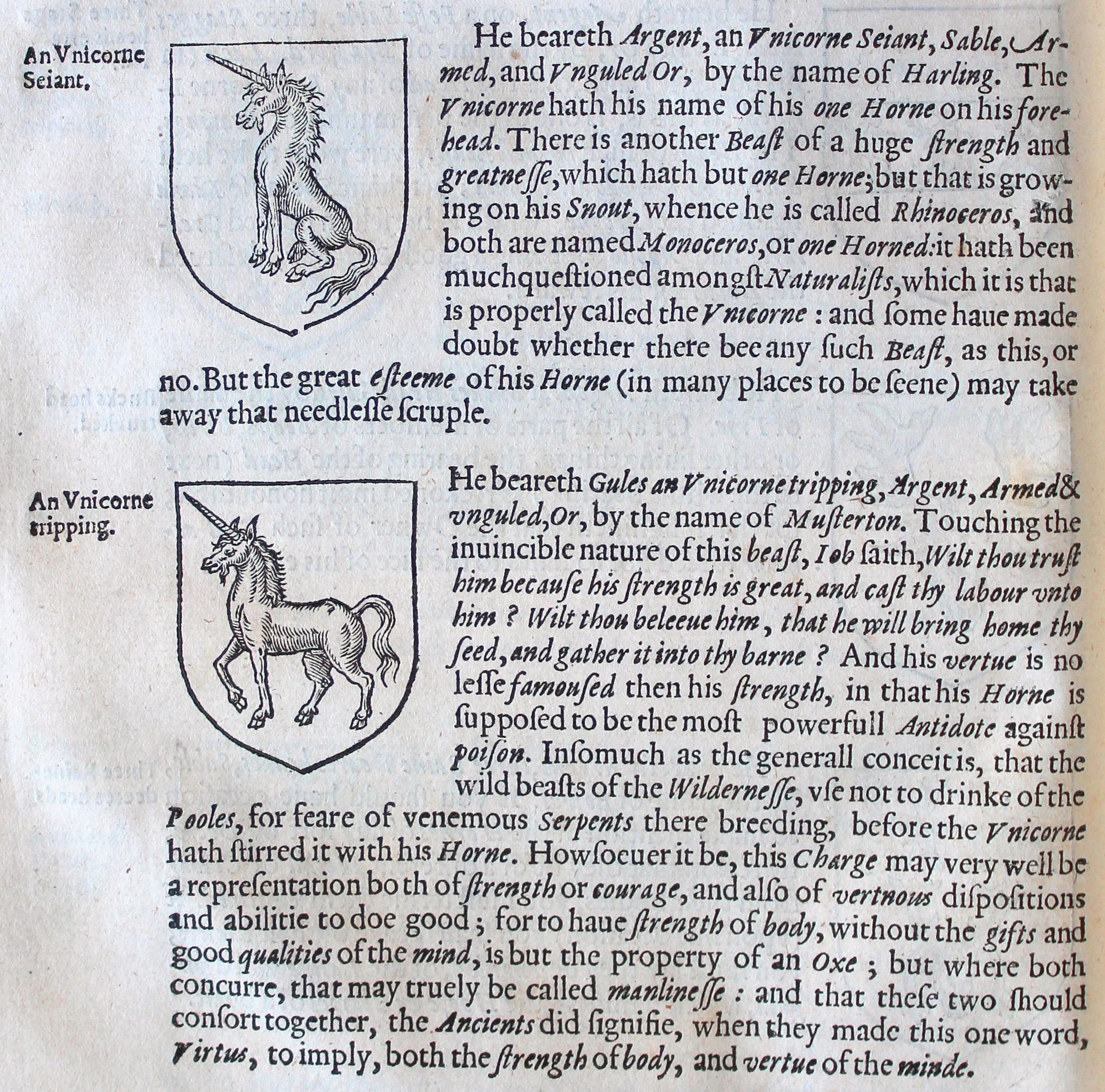 Another legendary creature often used in heraldry is the unicorn, a horse-like creature with a single large horn on its forehead. As can be seen in the early seventeenth-century illustrations below, unicorns are sometimes depicted with some of the attributes of goats, such as cloven hooves and beards. The accompanying text associates the unicorn with strength, courage and virtue and repeats the common belief that unicorn horns are an antidote to poison.