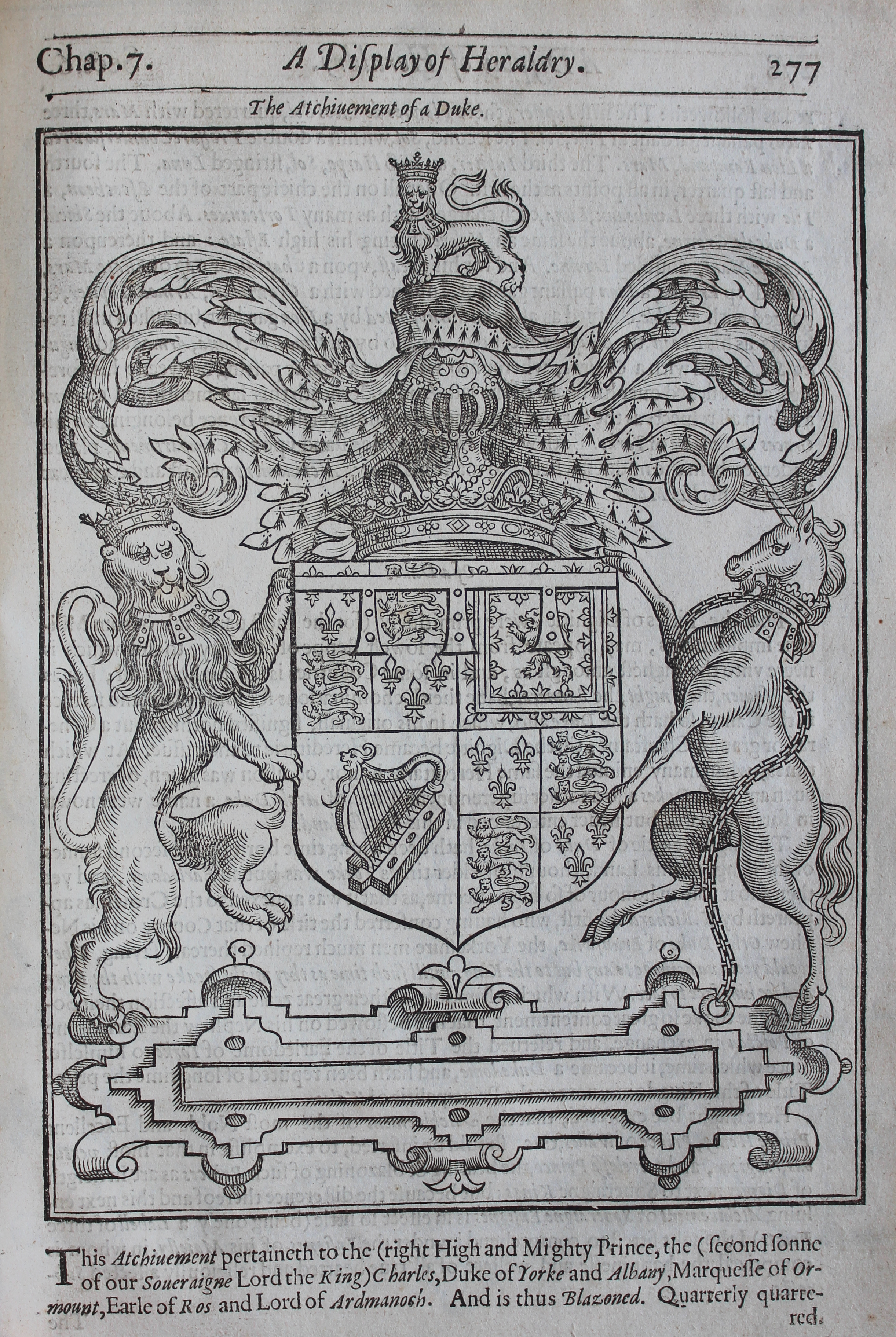 At the end of A Display of Heraldrie there are examples of regal coats of arms, including that of Charles, the second son of King James I, who was later to rule as Charles I. The lion and the unicorn flanking the shield still form part of the coat of arms of the United Kingdom, with the lion representing England and the chained unicorn representing Scotland. In Scotland, their positions are swapped and the Unicorn also wears a crown.