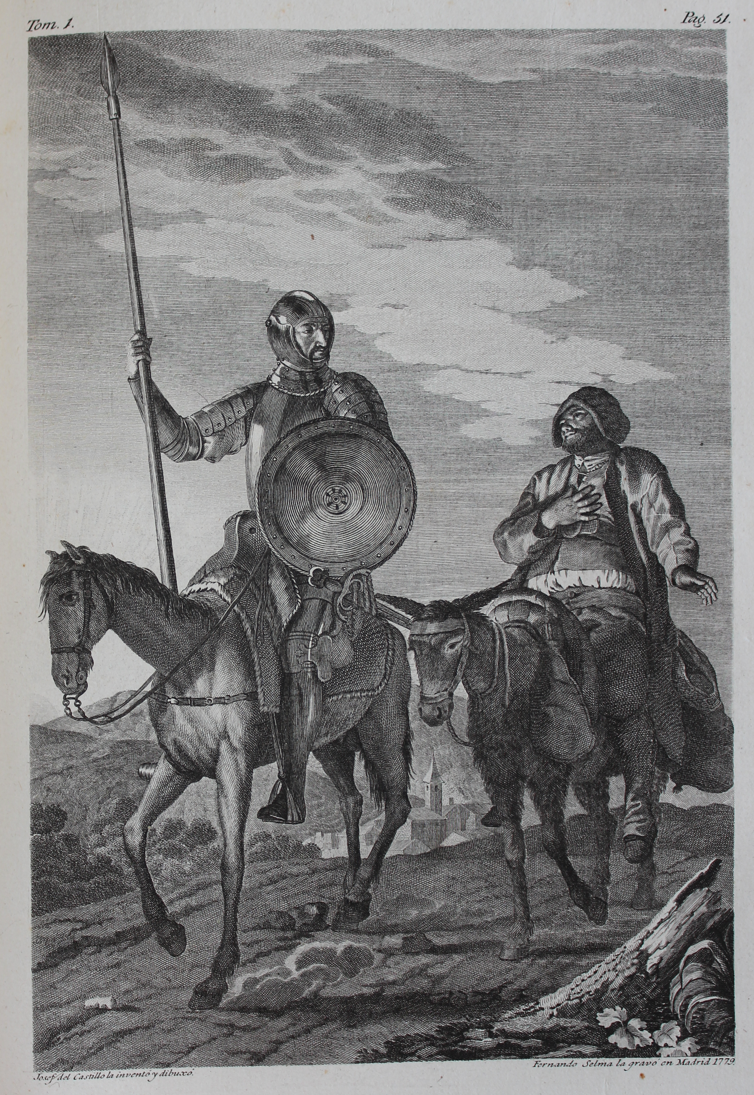 The following two illustrations come from a Spanish edition of the work from later in the same century. First we have a classic image of Don Quixote on Rocinante accompanied by his squire riding a donkey.