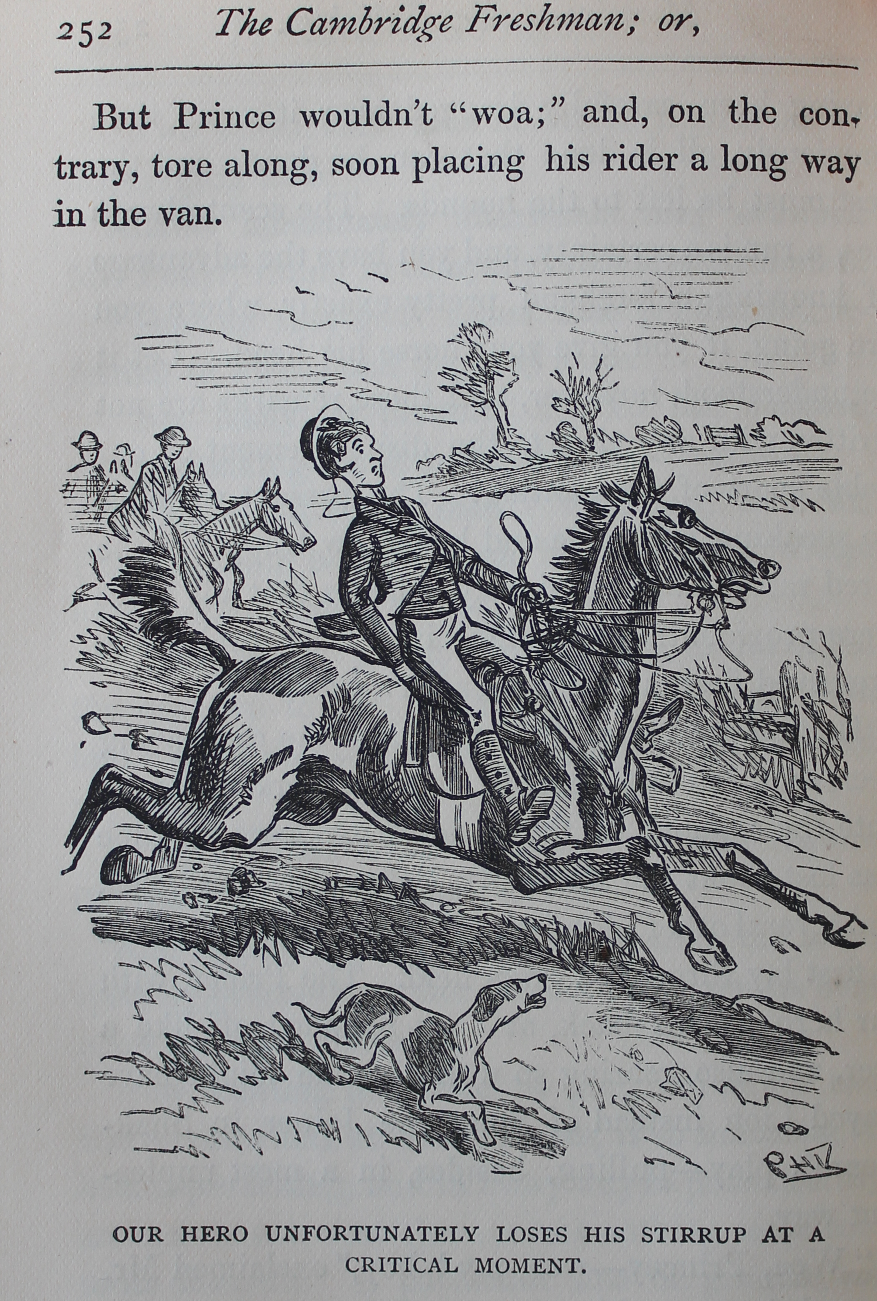 Our Local Collection includes the comic story of a Cambridge freshman, Samuel Golightly, who gets into various scrapes and adventures during his first year at the University. Below, Samuel participates in a drag hunt, where hounds follow a scent trail rather than a fox. His horse is somewhat too enthusiastic in pursuit, and he ends up tumbling to the ground, narrowly avoiding being trampled by another horse!