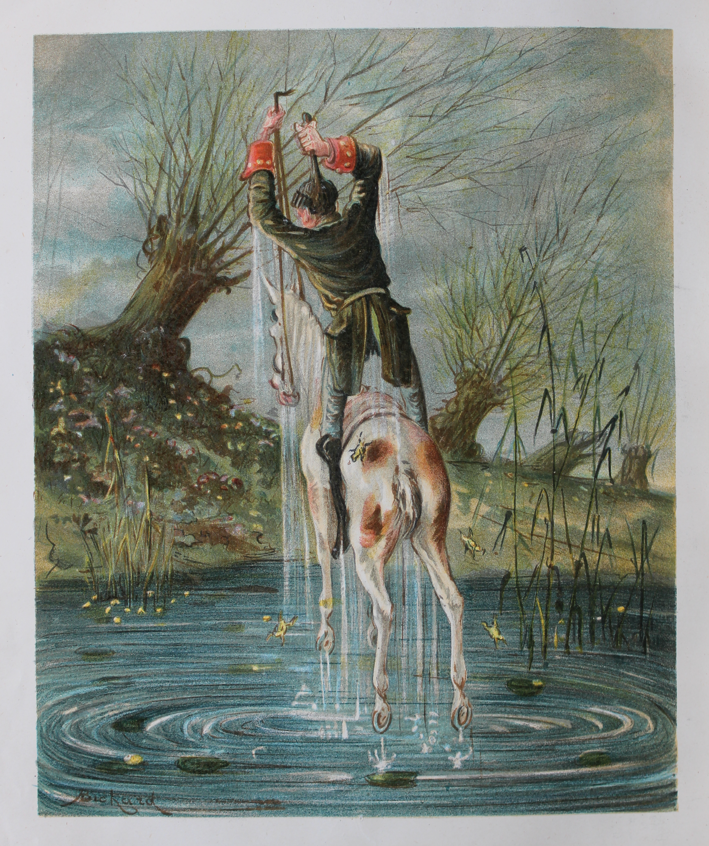 A late nineteenth-century edition of The Adventures of Baron Munchausen from our Rylands Collection of children’s books contains some wonderful colour illustrations by Adolphe-Alphonse Géry-Bichard (1842-1926). Although the Baron does not have a particular named horse accompanying him throughout, horses do feature in many of his tall tales. Included below are illustrations of the Baron shooting through his horse’s bridle to bring him down from where he has become attached to the steeple of a church, and of the Baron extricating himself and his horse from a pond by gripping onto his own hair and pulling!