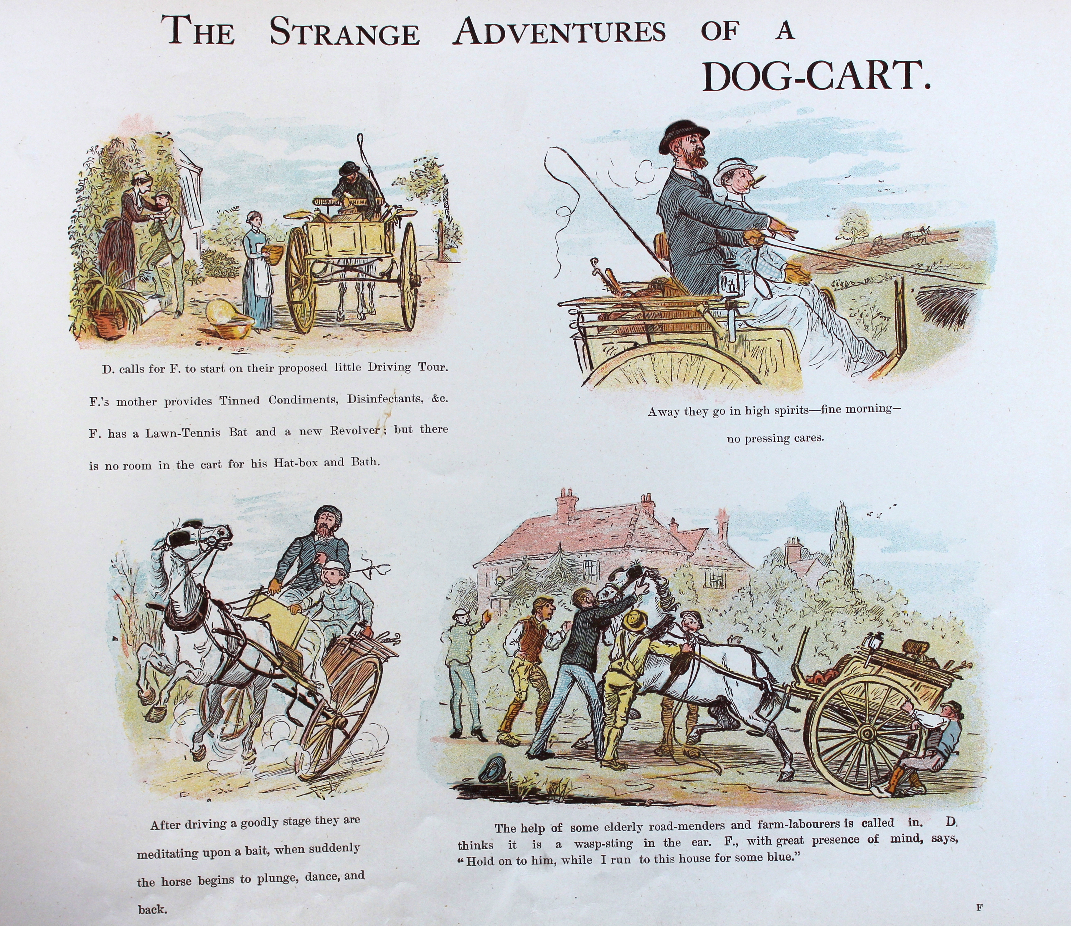 The Rylands Collection includes two collected volumes of some of Caldecott’s work for The Graphic, and they demonstrate his mastery of drawing horses in many different poses and situations. Below, the outing of two friends is temporarily disrupted when the horse pulling the cart is stung by a wasp.