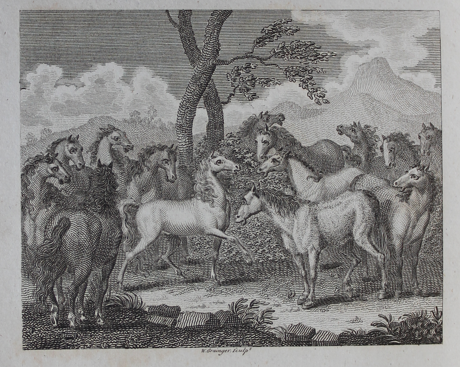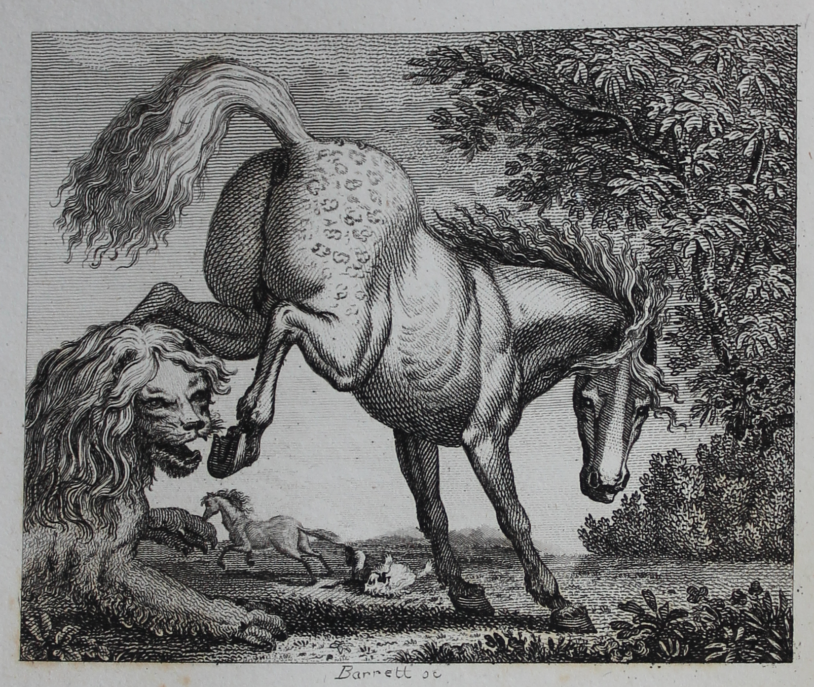 Horses make an appearance in numerous fables, including those of Aesop. The charming frontispiece below, depicting Aesop surrounded by animals and birds from the tales, comes from Fables of Aesop and Other Eminent Mythologists by Roger L’Estrange (1616-1704). If you look closely, you can see that two quirky bird-like creatures have been added to this copy in ink by an unknown hand!