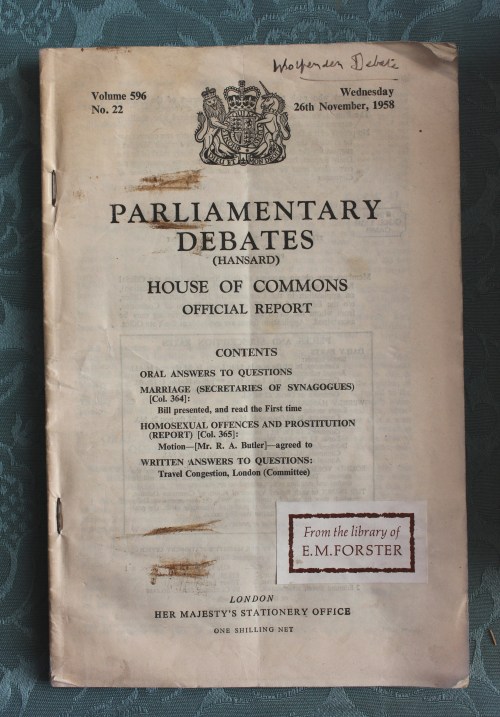 The ‘Committee on Homosexual Offences and Prostitution’, chaired by John Wolfenden (1906–1985), first met in September 1954. Its report, published in 1957, recommended that homosexuality should be legalised, but it was not until 1967 that this became law. This is E.M. Forster’s copy.