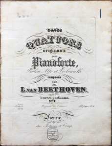 Trois quatuors originaux pour pianoforte, violon, alto et violoncelle … Oeuvre posthume (Vienna: Artaria et Comp., [1828]). Shelfmark: Rw.30.113-6/1-3. Title page