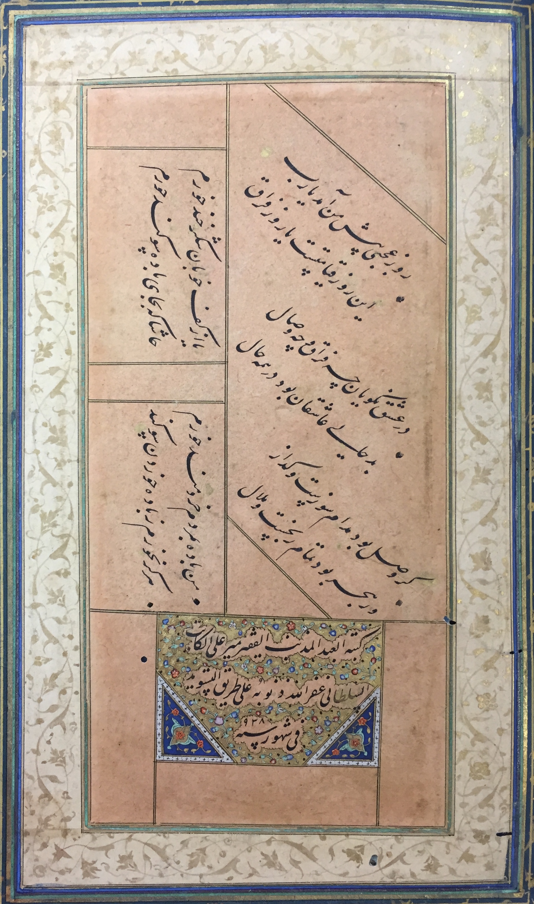 Left half of the double-page frontispiece, Dīvān of Hilālī, penned by Mīr ‘Alī Haravī, dated 938/1531-32 (King’s Pote MS 186).