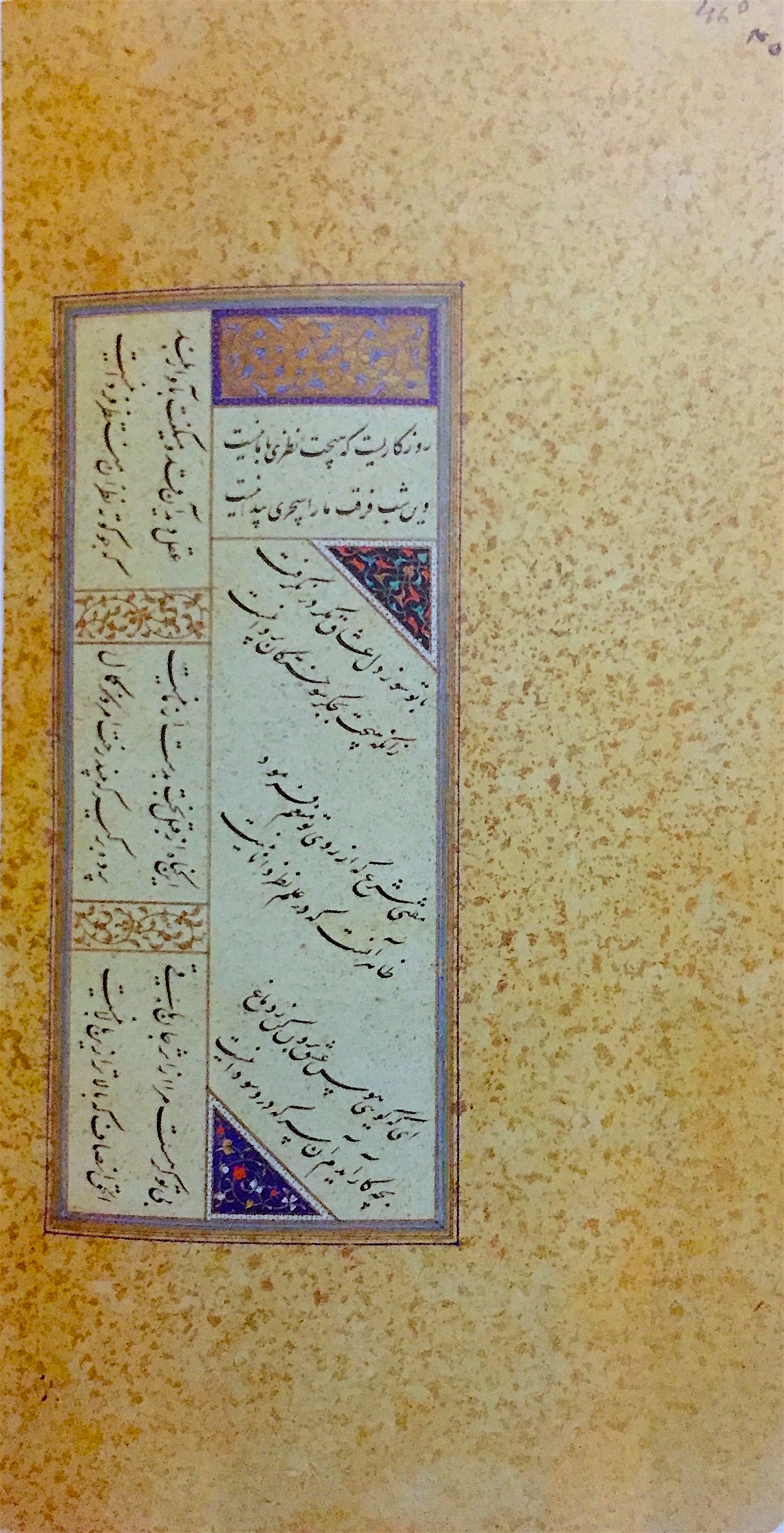 The textual content is a selection of lyrical poems (ghazals) by a prominent poet, Badr al-dīn Hilālī of Astarabad (d. 936/1529–30 or 939/1532–33). Hilālī had been in the literary circle of the Timurid Sultan Ḥusayn Bāyqarā (842–911/1438–1506) as a protégé of his bibliophile vizier, ‘Alīshīr Navā’ī (1441–1501), in Herat. Our manuscript, completed in 938/1531–32, is the earliest copy of Hilālī’s poetry and the closest to his time. To my knowledge, the second oldest manuscript from the same poet is dated 957/1550 (now in the Tehran Majles Library), almost two decades later than the King’s manuscript. Our manuscript was penned by the most prominent calligrapher of the time, Mīr ‘Alī Haravī, the Royal Scribe. The borders were illuminated and illustrated under the Mughals.