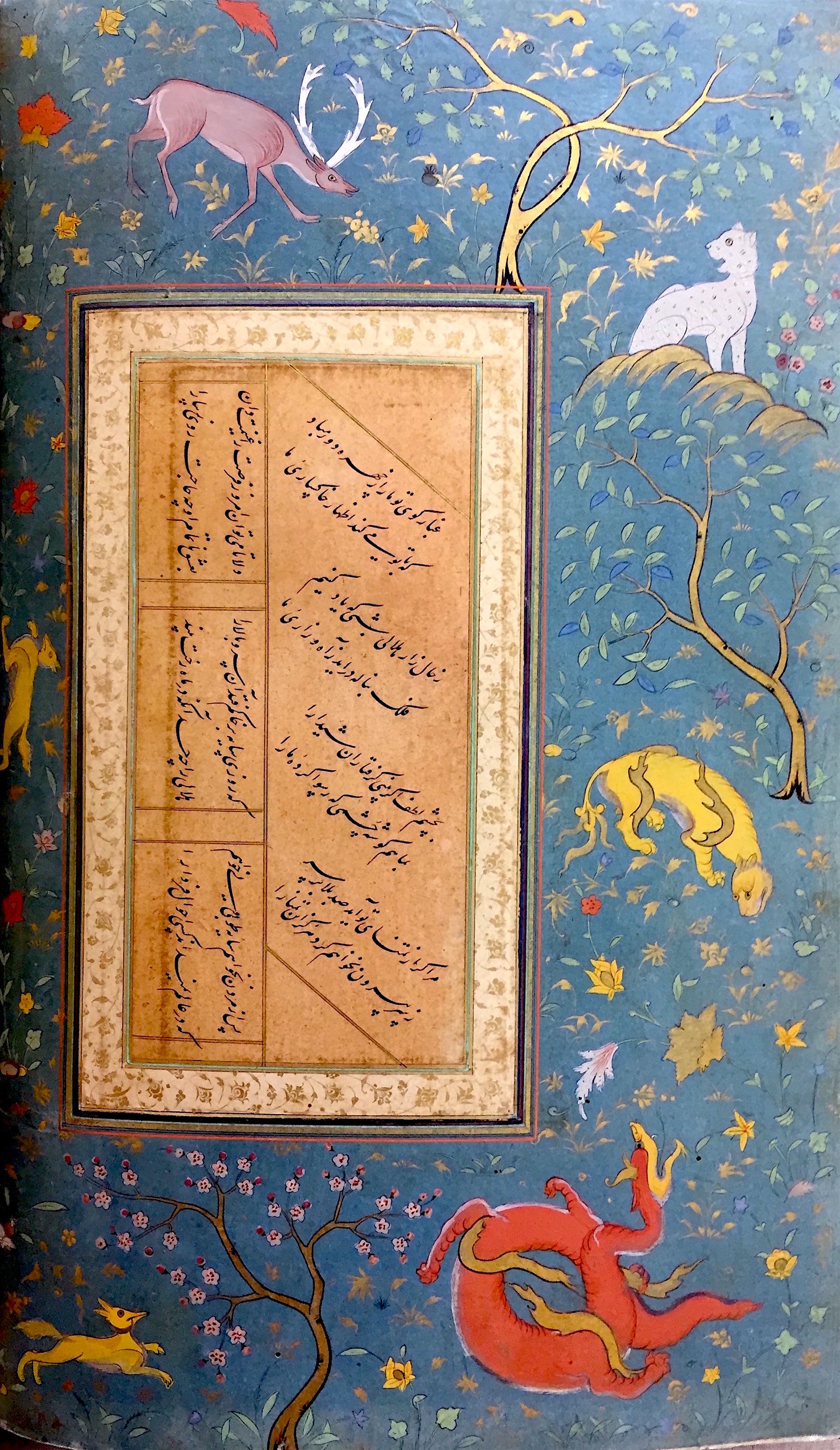 Similar animals, in different poses, are illustrated among trees and flowers in some of the margins on both dark and light grounds. The palette used in these illustrations includes gold and a variety of vivid colours.