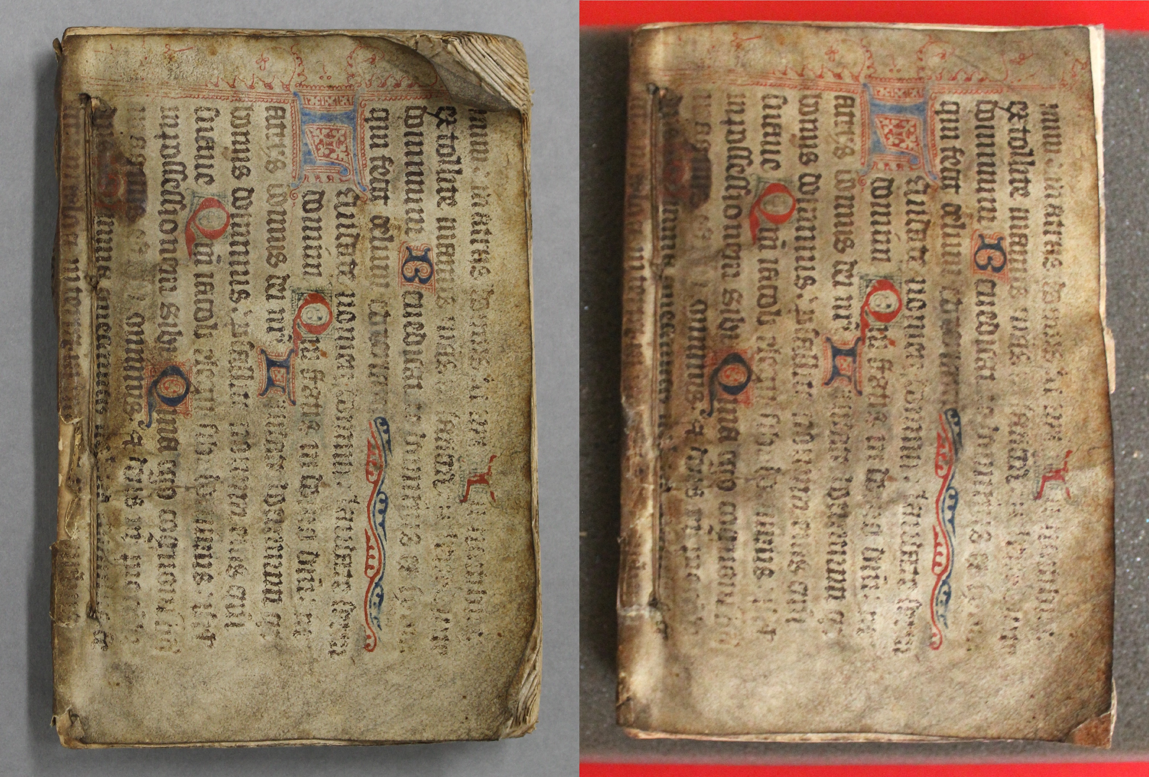 This small volume is bound in a parchment wrapper with manuscript writing on both sides and initials illuminated in red and blue. Recycling of manuscripts in book binding was a common practice. Thanks to the HLF grant, the binding has been repaired as shown in these images, before (left) and after (right) conservation:
