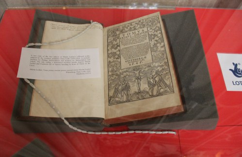 If you look closely at the next two images, you’ll be able to see the reflection of the chapel wall and the stained glass windows on the cases. This is volume I of the first edition of Martin Luther’s collected works. The title within a historiated woodcut border shows Martin Luther and Frederick III of Saxony kneeling in front of Christ on the Cross: