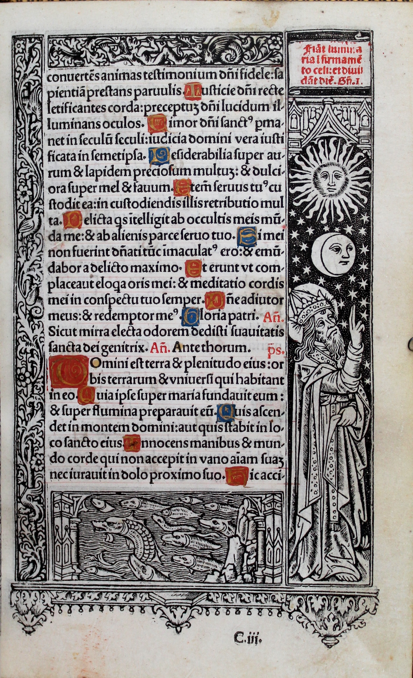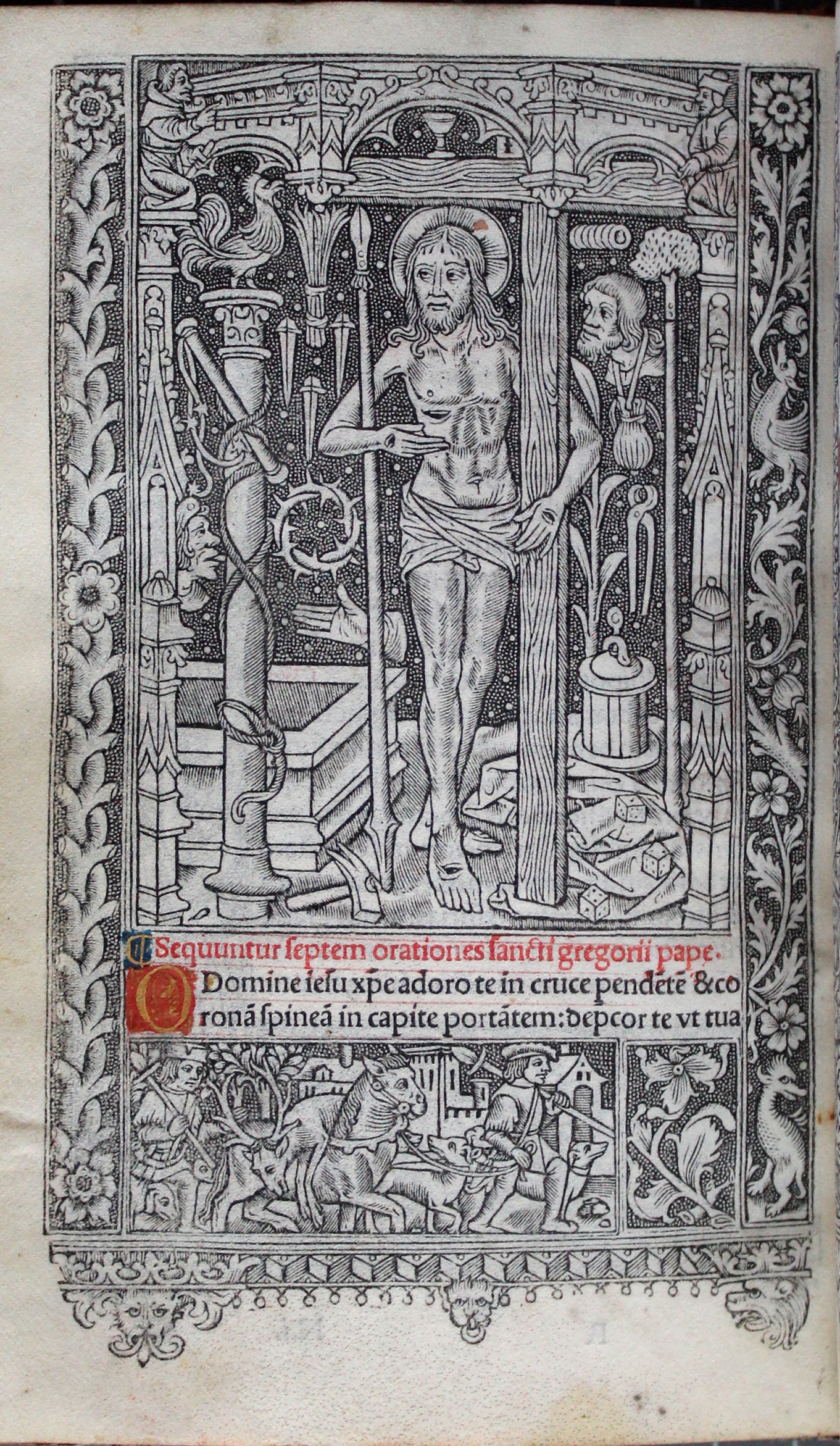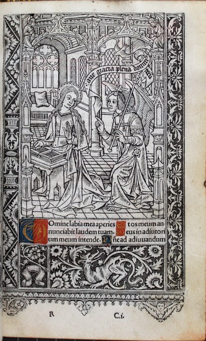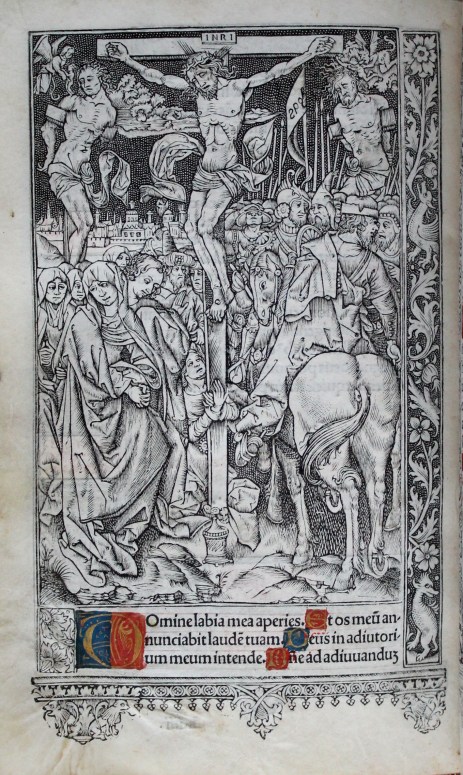 A group of miniature figures around the initial in the top left corner of this sheet represent the granting of the charter in Parliament. The figures kneeling in the left margin are the Commons and the Speaker, who bears a scroll. Above them, the Lords are depicted. They look towards the King, showing that even they are subordinate. Once again showing the importance of the initial in royal charters, the King appears kneeling at the centre of the initial ‘H’ in ‘Henricus’. Again, we see excellent strapwork. Above the Founder, angels carry his crown and the arms of England and France. Further angels carry the arms of St Edward the Confessor and St Edmund the Martyr, at the far left and right respectively. Above ‘Henricus’ are the patron saints of the College: Our Lady and St Nicholas. At the upper edge, just above Our Lady, the holy Trinity look down. Thus a hierarchical endorsement of the Henry VI’s foundation is depicted, from the House of Commons and the House of Lords below the Founder to the Lord above him.