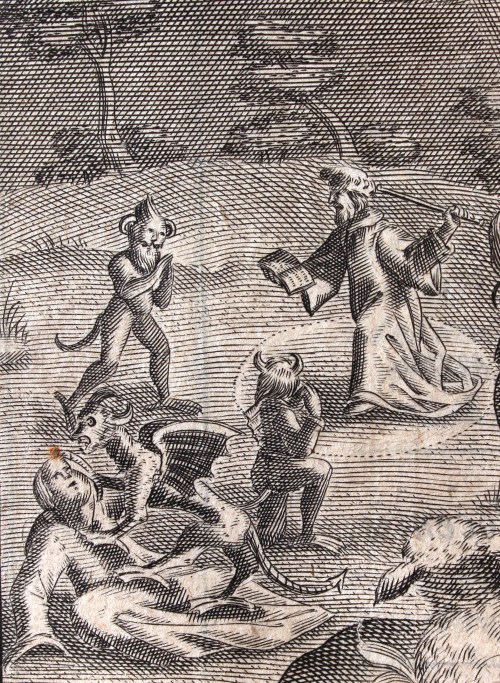 The first printed edition of the Divine Comedy appeared in 1472. This incunabulum from 1481 (a book from the dawn of printing, printed before 1501) includes the commentary of Cristoforo Landino with additions by Marsilio Ficino, and is the third edition of the work to be published. The engravings are attributed to Baccio Baldini after designs by Sandro Botticelli, eighteen of which are included in this copy, mainly pasted in spaces left by the printer for that purpose. Here we see the descent of Virgil and Dante into Hell, as they move to the circle of the fraudulent in the Malebolge, thanks to the mythological monster Gerion, who flies them down on its back. With the face of a just man, the body of a snake, the tail of a scorpion, and hairy paws, Gerion is an allegory of falseness and fraud, precisely because its human face displays a benign humanity while the serpentine and monstrous body reveals its evil: