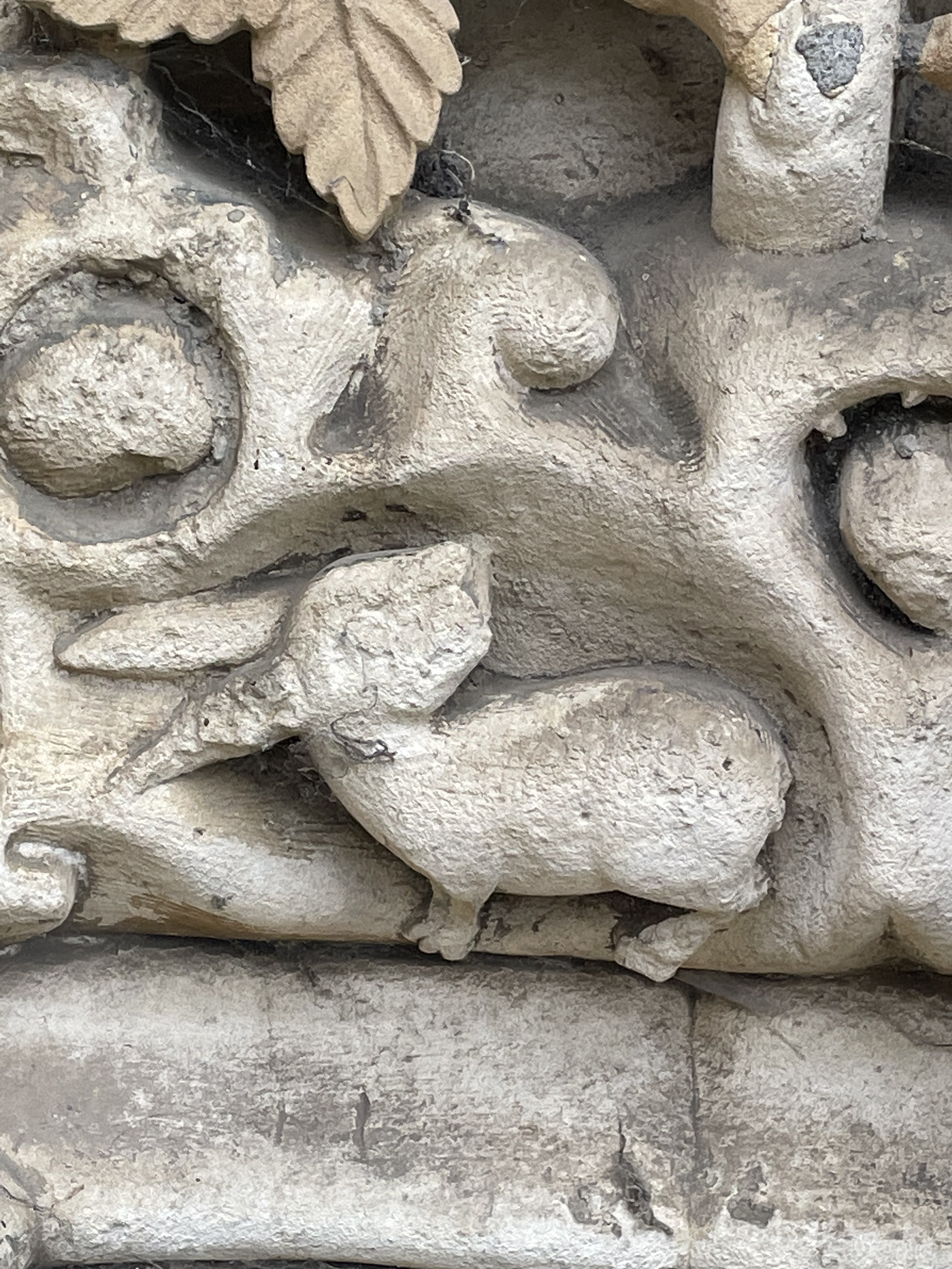We start however, with a rabbit who has hopped his way into the very stonework of the College Chapel! Designed by master mason John Wastell, in the early 16th century, the jamb of the Chapel’s west door boasts an elaborate pattern of roses, crowns, leaves and stems, and at the base of one side can be found a dog playing hide and seek with a rabbit. The dog is now sadly weathered beyond recognition, but the rabbit is still very much visible, gazing up into the foliage above.