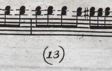 When the reference works let you down, it doesn’t have to be the end of the trail. You still have your own wits to rely on, and (more pertinently) the item itself. In this case, a major clue was provided by the plate number. Sets of music printed from engraved plates often have a number at the foot of each page, identical across all plates in a set, and here the style of the plate number (a number 13 in parentheses), combined with its proximity to a similar Plate number 1plate number (the item bound after it having a number 14 in the same style), led me to infer with some confidence that the unidentified publishers of this edition were Edinburgh’s Corri & Sutherland.