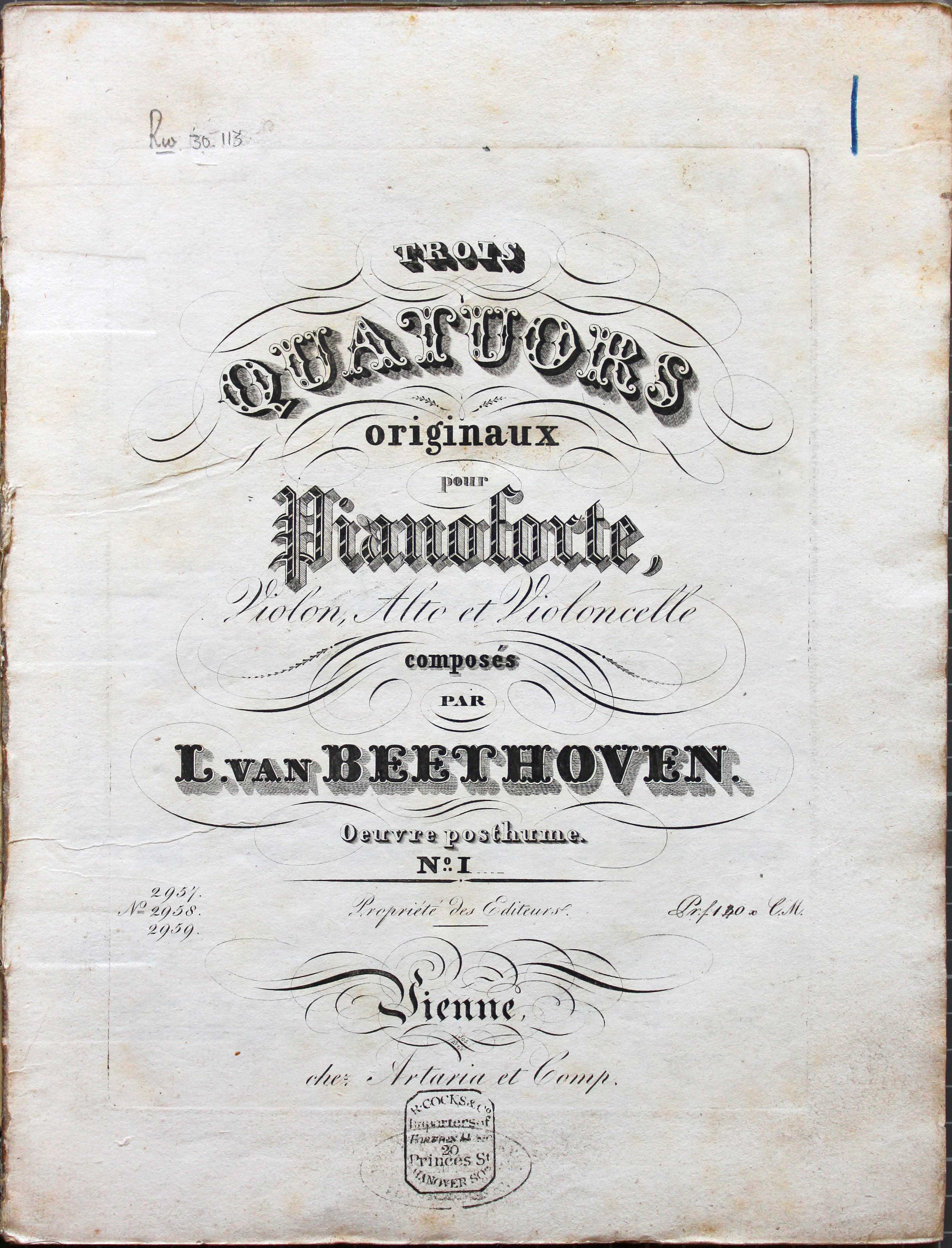 Trois quatuors originaux pour pianoforte, violon, alto et violoncelle … Oeuvre posthume (Vienna: Artaria et Comp., [1828]). Shelfmark: Rw.30.113-6/1-3. Title page