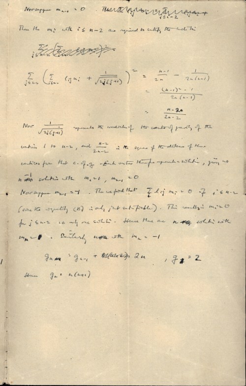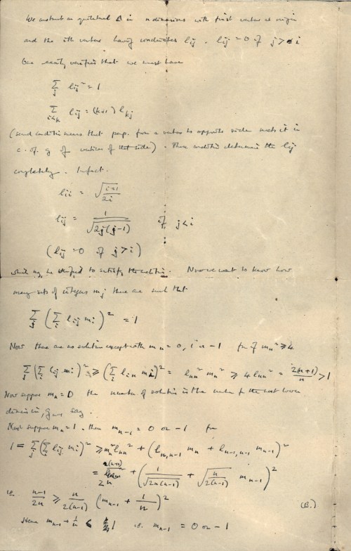 In March (2023), a page of mathematical writing by Alan Turing came up for sale at auction. It was a note about a mathematical problem, written to Rolf Noskwith probably in 1941-2 while they were both working in Hut 8 at Bletchley Park. It is phrased as a question about unit equilateral triangles in Rn (the n-dimensional real number space), the answer to which Turing then goes on to derive.