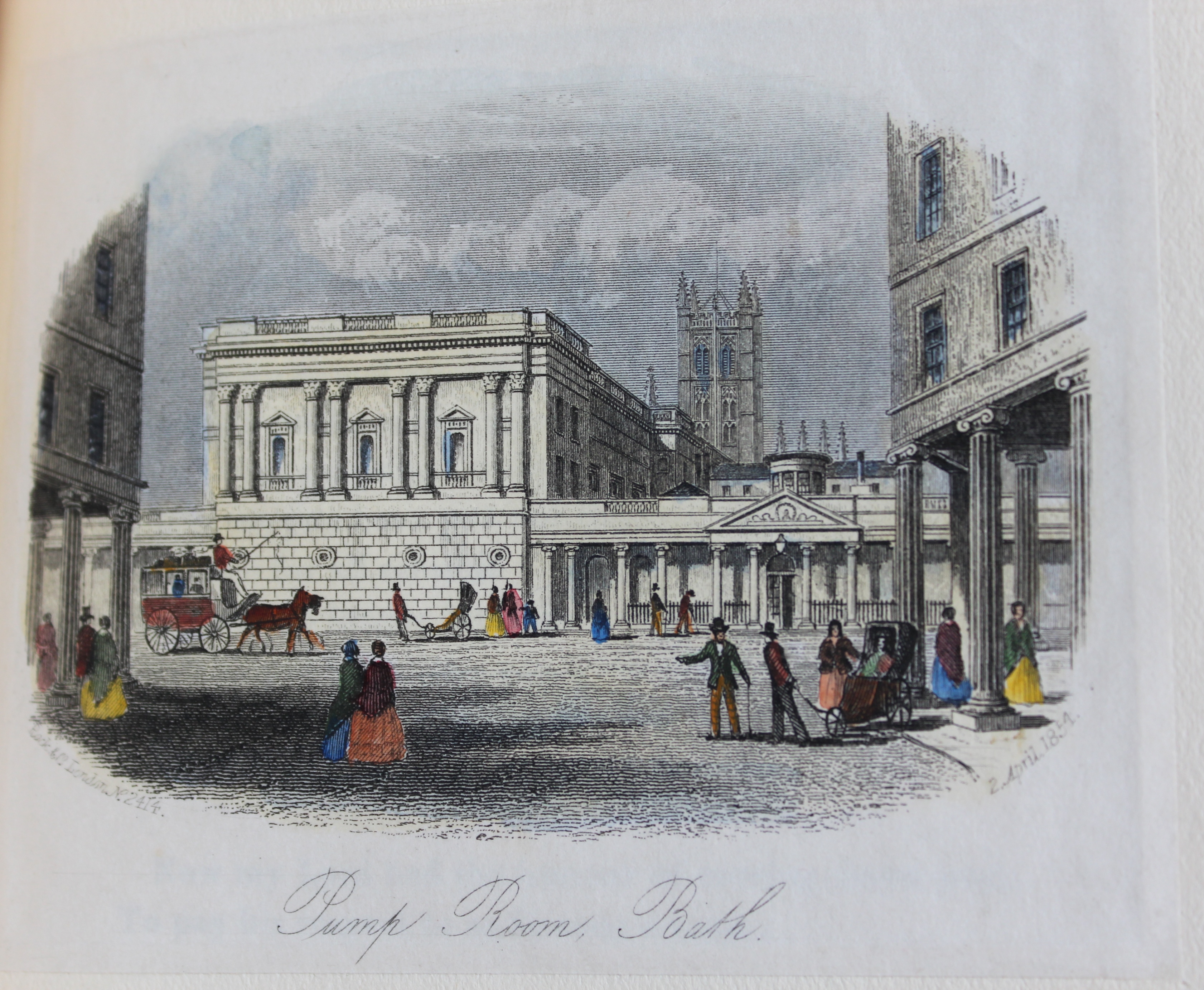 The Austen family lived in Bath between 1801 and 1806. Jane was familiar with the Pump Room, a venue for fashionable people, which is used as a setting in her novels Northanger Abbey and Persuasion. This image, from The New Bath Guide (1807), shows the Pump Room as it would have looked during Jane Austen’s time there.
