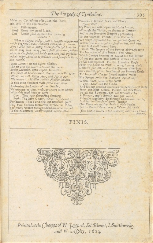 As it’s Folio Day, we thought it would be appropriate to provide some details about our volume and its provenance. King’s College’s First Folio is one of only 235 extant copies, most of which have been described in detail in Rasmussen and West’s The Shakespeare First Folios: A Descriptive Catalogue. Our copy has recently been digitised and can be viewed in its entirety on the Cambridge University Digital Library website (a post about the digitisation process will follow in due course).